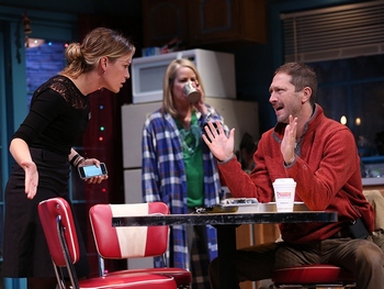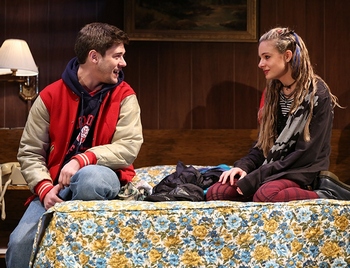 Lost Girls, then, is two different coming-of-age stories, one set in the present of early middle age and one in adolescence, but both examining how personal attitudes and self-confidence affect the growing-up and growing-wiser processes. Pollono handles them both gingerly but well, particularly at the point where the separate paths converge near the climax of this solidly realized 80-minute evening. With the help of director Jo Bonney (and set designer Richard Hoover and lighting designer Lap Chi Chu, who keep the action moving fluidly between the scenarios), Pollono has carefully calibrated the similarities and differences between the women, and showed how one reflects the best and worst of the other as they progress along eerily similar, and likely ill-fated, trajectories. If the central four characters have been suavely, even movingly, executed, what surrounds them can sometimes feel excessive. Linda and Penny contribute little beyond comedy, the former for her acerbic cracks and the latter for her nearly vacant naïveté in the face of potentially deathly serious circumstances. Lawrence and Fahy play the women honestly and sincerely, but can't integrate them into a narrative that has far more substantial things on its mind. And for as good as the second half of Pollono's play is, when the ramifications of these tangled personal histories become unavoidable, the early scenes between the girl and boy on their makeshift road trip push their bubbly, youthful ardor a bit too far. The characters and the writing (and thus the performances of the young actors, who both gracefully highlight the inkier shades beneath their roles' well-groomed façades) have a stronger impact when they're about how the two are forced to deal with the kinds of weighty issues that can bring people together and, on sadder occasions (like those Maggie and Lou have endured), rip them apart. Not entirely, however. Some bonds, once forged, can never be entirely broken, and one of the most serene pleasures Pollono provides here comes from seeing how these people discover that themselves, and then live up to the consequences. What Perabo and Moss-Bachrach put so nakedly, so bewitchingly, on display is rarely happy, and perhaps not even that admirable. But it's a wrenching, convincing depiction of being yoked to someone even after you think you've both given all you can. I can't say for sure what forever looks like, but it's not hard to believe that it looks a lot Maggie and Lou, working in good times and bad to forgive, forget, and move on, even though they know, deep down, they're stuck with each otherand probably wouldn't have it any other way.