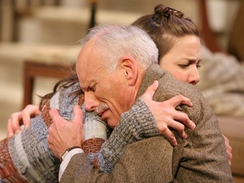But by the time the show is over, Haidle has made a convincing case for its veracity. Though the vehicle he's written is too often sparse, its primary message is a sufficiently fresh variation on what could easily be a tired conceit. In Haidle's conception, undying devotion doesn't mean you'll give all your life to one person, so you'll be devastated if she dies. Instead, you'll make your life into her, so that even after she vanishes you'll never be left alone. This subtle twist is enough to align this play with Haidle's other New York work, which in Mr. Marmalade (at Roundabout) and Rag and Bone (at Rattlestick Playwrights Theater) has leaned toward the brutally symbolic. The only thing violent in either the script or Nicholas Martin's production, though, is Gustin's love for his wife Loretta. It so completely consumes his adult life that neither his daughter Zephyr nor a visiting assisted-living worker named Suzanne can escape its event horizon. So it makes sense that all three women in Gustin's life are played by a single actress (Rosie Benton), even though Gustin himself is played by at three different stages of his life by three different actors: at 28 (by Robert Eli), at 58 (by James Rebhorn), and at 88 (by John McMartin). The ages are not coincidental, either: Each coincides with an astrological "Saturn return," named for the length of time that planet needs to orbit the sun, and each of which supposedly ushers in a new wave of challenge, doubt, and accomplishment in life. That's what we see in Gustin, especially as reflected by these three crucial women. As a young man struggling to pursue a medical career, he's recklessly smitten with Loretta, unprepared for either fatherhood or being robbed of his wife all too soon. When Zephyr is 29 and yearns to make her own way in the world, Gustin must finally cope with his losses and find a new path (and maybe a new mate). After Zephyr herself dies and Gustin faces 90 and beyond alone, he hooks onto Suzanne as a final way to commune with the most important woman in his life he barely had time to know.