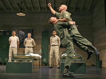 Perhaps. But the Roundabout Theatre Company's sleek and stirring revival of the play at the Laura Pels Theatre disarms most of these criticisms before they form in your head. Director Scott Ellis has wisely chosen to shy away from the "big-picture" angle, which in the original production must have been like treating the gaping wounds of the recently abandoned conflict with salt water. Instead, he focuses more intently, and to rewarding effect, on the human elements of the story, the fears, the hopes, and especially the prejudices that unite unite men in both war and peace. The familiar issues arise from every side, undulating and overlapping as these men just out of boot camp cope with the impending terror of combat and of the other elemental components of America's melting pot. Billy (Brad Fleischer), a conservative, college-educated Wisconsin boy, is never sure what to make of the brittle Richie (Hale Appleman), a privileged Manhattan import with a loose tongue and dubious sexuality. Their roommate Roger (J.D. Williams) stands in stark contrast to the frequently visiting "transient from P company" Carlyle (Ato Essandoh), whose urban upbringing hasn't prepared him for the rigidly regimented military. The white Billy and Richie do not inherently connect; nor do the black Roger and Carlyle. Their loyalties and outlooks fall along very different lines, making their backgrounds, their attitudes, and especially their actions the deciding factors in who relates best with whom. Billy and Roger relate because each is on track for a military career, and each takes his service seriously. Richie meshes with Carlyle not just because they're both outsiders who see the Army as an extended joke, but because they both act freely on their impulses. Richie longs for Billy, his body as well as his normalcy, despite everything about Richie running contrary to Billy's belief system. Yes, the play creaks in examining the emotional burden of the wisecracking, self-loathing homosexual, but it compensates by being otherwise sufficiently steeped in recognizable realities. The condescending offense Billy takes to each of Richie's innuendos. The callousness of the drunkenly drifting sergeants, Rooney and Cokes (John Sharian and Larry Clarke), who oversee them and inculcate them into the real world, that gradually seeps down into the company. The atmosphere of violence that gently escalates from the supposed suicide attempt of another soldier (Martin, played by Charlie Hewson) into the climactic expurgation of the societal scions unwittingly conspiring to keep one of the men down. Ellis never approaches the somewhat predictable it as a foregone conclusion. He builds the rage and the resentment gradually, letting cool disdain and indifference simmer until all they can do is boil over. The pace occasionally slackens, especially after Rooney and Cokes pay their first intrusive late-night visit near the end of Act I, but this is more a function of the play itself, which in its middle sections becomes startlingly uneventful. The actors, too, are less convincing in these scenes, which force them to be more reflective than combative; bunkside philosophizing does not always go over well here. But when they're more actively involved in pursuing the truth about each other and themselves, they uncover smart and subtle shadings in men who don't always demand such qualities. Fleischer finds plenty of open-minded sensitivity in the forward-thinking Billy, spiritually uniting him with Richie in an unexpectedly clever way. Appleman is sometimes too forcefully arch as Richie, but always seems to be hiding real pain just beneath his oh-so-clever façade. Williams is wonderfully understated as Roger, passionate and businesslike in equal quantities. Essandoh's evocation of Carlyle's hair-trigger personality is terrifically in tune with the character's uncertainty about all aspects of himself, which cross even the other characters' well-established barriers, and leads to some of the production's wildest and most profoundly unnerving moments. The sense you get from all of them is perfectly in line with the title, which refers to what a skydiving soldier sees above him should his parachute fail to open. They're all victims of a culture in freefall, soon to collide with the cold, hard realizations that come when undeveloped trust wins out over common sense. The United States may have progressed in a great many ways since the early days of Vietnam and Civil Rights that Streamers documents, but the play remains a searing reminder of how far we all still have to go to avoid hitting the ground.