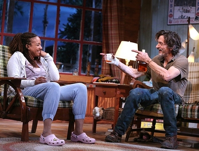 Certainly, this kind of relationship between truth and reality is not new territory for Auburn; it's infused many of his works, from his Pulitzer Prizewinning Proof 14 years ago to his most recent Broadway venture, The Columnist, which played in 2012. And throughout Lost Lake, which has been directed with an excess of sensitivity but not much creativity by Daniel Sullivan, its two characters, Veronica (Tracie Thoms) and Hogan (John Hawkes), seemed poised to discover and movingly work through the shattered truths they don't want to admit are already piled at their feet. That doesn't quite happen. Auburn skillfully delineates the similarities and differences between the two, when they meet in the early spring at a lake house located just an hour or so outside of New York. (The shabby but inviting set, complete with verdant skyscape backdrop, is by J. Michael Griggs.) Veronica is making plans for late summer, but doesn't have a ton of money to spend; Hogan has big plans for fixing up the place (his de facto residence) that he just needs a few months to execute. They haggleshe's good at thatand establish a sort of buyer-seller friendship that should resolve itself by the time the final payment and repairs come due. Naturally, when Veronica arrives at the agreed-upon date, two weeks before Labor Day, things are rather less than completed. It doesn't take long for what initially seems like a subtle, intricate story about class and even race becomes a far less compelling tangle of concerns. Veronica's troubles with work (she declares herself a nurse practitioner, which may or may not be entirely accurate) and Hogan's with basic subsistence (divorced and estranged from his college-age daughter, he has no money and is relegated to rooming with his brother and disagreeable sister-in-law) seem intended to color and inform the actions of each, but broaden rather than deepen. As a result, we get distracted from exploring the more interesting bond Veronica and Hogan share. This eventually pays off, to some degree, in the final scene, which is set half a year after what turns out to be a dispiriting (if not outright disastrous) lake trip. A shocking set change and autumnal rethink of Robert Perry's lighting plot add a distinct, melancholy vibe to a play that's spent most of its preceding 75 minutes teetering on the edge of comedy. When Veronica and Hogan, stripped of their façades, are forced to confront themselves and each other without their usual protections, Auburn's writing becomes more touching and more energized, as though the playwright were just waiting for the opportunity to make things real. Even so, Auburn's resolution requires, or at any rate assumes, that we accept the formation of a tenuous friendship between the two. And given their constantly antagonistic attitudes toward each other throughout, and an overarching lack of intimacy linking them in some more spiritual way, that's hard to see as part of the action. There's not enough reason to believe, as Auburn demands, that they come closer through their trials; their experiences are far too individual to encourage that. Both Thoms and Hogan work hard to fill in the gaps, and underplay the desperation that drives Veronica and Hogan. Thoms projects a compelling faux-sophisticate who doesn't want to cop to what she sees as her inherent unworthiness, and Hogan layers loss and frustration in his depiction of a man at odds with society and himself. But for all the times the characters to promise to show us what really makes them ticket, to move beyond the mere reflection of their agonies across gender, racial, and economic lines, their souls remain as remote as the cabin in and about which they argue. Auburn's attempts to puncture Veronica and Hogan's hearts aren't enough to help Lost Lake do much more than skim the surface.