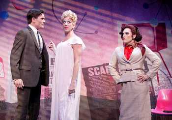 What indeed. To reveal too many more details would spoil a dazzlingly brief evening (scarcely 80 minutes) that thrives on them, but alien attacks, extraterrestrial impregnations, Mattie and Lucinda's teeming jealousies and tangled backgrounds, and even a go-get-em musical number for Mattie (which Pecorino sells with uncommon flair) all play critical roles. And even if it weren't packed with absurdities, Thomas and Elliott's story is a substantial one, and even bearing a thoughtful message for our times. (No, seriously.) But it's the execution that matters most, and it's top-notch. Elliott has directed with razor sharpness, never losing either a laugh or a narrative thread (however thin) that's presented to him. The design is modest, but B.T. Whitehill's comic-book backdrop, Gail Baldoni's glimmeringly silly costumes (augmented by Gerard Kelly's impeccably chosen wigs for the women characters), Vivien Leone's moody lights, and Drew Fornarola's evocative Z-movie-style score establish an appropriately seamy flavor for this show's anything-can-happen world. The performances are outstanding across the board, with Pecorino a particular standout as he flips effortlessly between the emotionally battered "other woman" and the put-upon heroine unwittingly tasked with saving Earth. Berliner's stuffed-mouth portrayal of Gregory is just right for a reluctant man in the middle, and Dell'Armo is an acidic delight as the scheming Lucinda. Quinton, a Ridiculous Theatrical Company veteran who knows this kind of humor better than anyone, is predictable perfection as Florence, and delivers a hysterical curtain-raising recitation of her close encounter that immediately fixes her and everything around her within the firmest sector of improbability. Devil Boys From Beyond was a major hit at the 2009 Fringe Festival, which is where I first encountered it. I couldn't detect any significant differences between that production in the West Village and this one; even the cast is, to a man, identical. The show's future, then, would seem to hinge on whether uptown audiences will buy its gleefully downtown vibesomething Busch avoids by keeping his Golden Age Hollywood send-up safely anchored in SoHo. Whether this show will succeed as well in the heart of the Theatre District is anyone's guess, but it will roughly triple the area's laugh quotient for as long as it's able to camp out.