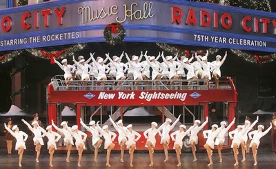 That that kick is delivered time and time again during the 90-minute show from the lengthy, lovely legs of 36 always-delectable Rockettes is just the froth on the eggnog. They remain the evening's undisputed stars - and, when in the form of an old-fashioned chorus line (whether costumed by Frank Krenz as reindeer, toys, or themselves) or in the preciously precise "March of the Wooden Soldiers," its most dazzling special effect - but they're one part of a thoroughly integrated evening of old-fashioned entertainment that for 76 years has pinpointed and celebrated the social and spiritual meaning of Christmas in New York. Because the show's chemistry is so specific, in most circumstances it tends to noticeably change little from year to year. (Last year's full-scale rethinking for the diamond jubilee was a notable exception.) The 2008 incarnation is definitely in that category, with director-choreographer Linda Haberman polishing and expanding most of the 12 sequences comprising the evening, but instituting changes more about appearance or degree than foundation. When Santa (the jolly and stalwart Charles Edward Hall) reveals to a pair of skeptical young boys how he magically appears in thousands of places at once in "Here Comes Santa Claus," the congregation of Kris Kringles seems to step higher, and for longer, than before. The whirlwind tour of Midtown in "New York at Christmas," with the Rockettes riding on a real double-decker bus, takes in more sights and concludes with eye- and ear-popping fireworks. And, though I can't identify any specific changes, I thought the 3D component of Santa's sleigh ride from the North Pole to Manhattan looked crisper than it ever has. Haberman hasn't skimped on pointing up her performers, either. The challenge tap topping the fully danced "Twelve Days of Christmas" specialty for the Rockettes had a percussive urgency this year it didn't last year. The prima-ballerina bear in the lighthearted abbreviation of "The Nutcracker" humorously hogs the spotlight for longer than in years past. Conductor Gary Adler's enormous orchestra earns its platinum star just by showing up, and essentially dwarfing any you'll find on Broadway except (maybe) for the one at South Pacific. The improved glitz of everything else just makes you appreciate the quiet pleasures of the climactic "Living Nativity" all the more, when living animals join the dozens of cast members to anchor the evening with its always-moving rendition of the Greatest Story Ever Told. But Haberman ensures in that scene, as in the ones that precede it, that your focus is never misplaced. Through no fault of scenic designer Patrick Fahey, whose constructions of the Radio City Music Hall façade, Santa's Workshop, and everything in between (often with the help of lighting designer David Agress and Batwin & Robin Productions for the giant upstage LED board) are never less than astounding, the human scenery tends to dwarf the sets. Even at, or perhaps especially at, Radio City Music Hall, that's how it should be. How nice that even if we can count on nothing else in the world right now, we can at least depend on that.