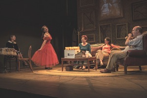 The ghost in question is Lala (Emily Verla), who is bound to her home in Oklahoma where her family has gathered after her funeral to clear out her possessions. It seems she has some unfinished business to take care of before she is free to leave the world behind. The year is 1999. Time, however, is fluid. Throughout the evening we will be making stops across the entire range of the twentieth century, as letters, photographs, and, most of all, the memories of Lala's cousin Lucretia (Kathleen Huber) bring forth four generations of deceased family members, all women, the bearers of the stories that bind them together. Lucretia is astonished to find herself, at age 60, to be the keeper of the flame, with no else alive who remembers her as a child. Her own brood, daughters Maud (Rachel Caplan) and Julie (Christa Kimlicko Jones), and son Augie (David Volin) show little interest as she digs up the past, particularly as she tends to repeat herself with some frequency. Only Lala, ever present, seems to listen. Both Lala and Lucretia were raised by a reluctant caregiver, an aunt who took them in separately as each was orphaned. They were always close, and you could say it is these ties that keep Lala bound to her home. But there is more purpose to Lala's presence, having to do with a fairly large sum of money that keeps turning up in batches in various drawers, closets, handbags, and other hiding places. While the siblings debate what to do with the money, the past continues to intrude. What gradually reveals itself is a portrait of generations of women who have endured the hardships imposed upon them by virtue of their gender and the subservient and dependent roles they were pressed into playing with respect to the men in their lives. Only Lala tried to break out of the mold, when, in 1946 at the age of 18, she married on a whim a much older man, known as B. (Tom Green), who showered her with the material goods she craved but provided her with little affection. We mostly see them together at their regular restaurant, where B. decides what Lala will eat and where they are served always by the same waiter (Ryan George), whose interactions with them take on some significance. There is a lovely denouement in which Lala's ghost manages to make her final wishes known. But more than anything, A Name For A Ghost To Mutter is a delicate short story of a play and a portrait of a family (the cast is joined by Lori Fischer and Kelly Kunkel as ancestors). There is some bickering among the siblings, but no great outbursts, accusations, or shocking revelations. And even their mother's repeated tales about their relatives' eccentricities and troubled lives garner little more than rolled eyes. If there is a sad thought to all of this, it is that once Lucretia dies, the stories are likely to be lost forever. The able cast is skillfully directed by Judson Jones, and the use of carefully detailed touches makes for a lovingly imagined production. In one scene, for example, Julie finds and puts on one of Lala's old designer dresses. Later we see Lala wearing that same dress when it was new (great costume design by Sherry Martinez). Special credit must go to John D. Ivy for his exceptional and seamless sound design (banging pipes, a ticking clock, music), which provides the perfect mood for this wisp of a ghost story.