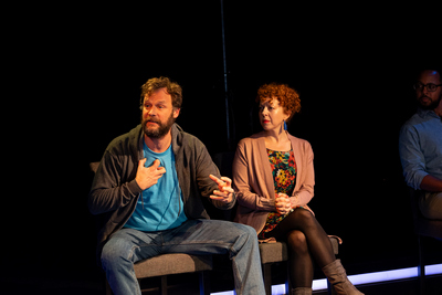 Written by Michelle Kholos Brooks, War Words is based on more than a dozen interviews with military personnel. The individuals span different ranks and are drawn from across the armed services. In addition, the cast of fourteen includes several military veterans, who are joined by actors without military experience, which contributes to the authenticity and veracity of the accounts presented on stage. With direction by Sarah Norris, the play begins with the performers seated in the audience, and as the houselights dim, they emerge from the house to enter the playing space. (Julia Squier's commonplace costumes help make the actors unnoticeably different from the spectators.) The initial impression is that they are just like us and could be us. Structurally, the play resembles A Chorus Line, but with veterans of the wars in Iraq and Afghanistan instead of dancers. In the course of the evening we get to know, among other things, each individual's reasons for joining the military. For instance, several signed up in reaction to 9/11, others for educational opportunities, and others for the chance to see the world. Some of the stories about war and its physical and psychological impact on the lives of the men and women are harrowing. Army and Air Force fighter Danny (Jakob von Eichel) describes the horrific effects of PTSD and the toll this takes on his wife (Bethany Geraghty) and family. The uncontrolled violence he describes is chilling. In another case, former marine Pete (John Siciliano) lost a leg as a result of combat, and he comically explains: "I've fallen out of bed a couple of times because I just forgot. I wake up, I step out of bed and the next thing you know I'm flat on the floor. And then it's, oh yeah, I've got no leg!" Many of the stories are quite moving, including the account of Janis (Haythem Noor), an Afghan translator and Matt (John Concado), a soldier he saves. With so many different characters, though, it is hard to get to know each of them individually. Additionally, issues and critiques of the military (such as the apparent lack of concern from the higher-ups, incidents of institutional sexism and sexual abuse, and the lack of resources for returning vets) are introduced but not fully explored. Rather than a deeper understanding of the one percent who serve, we are given snapshots of the disparate lives and experiences. That's a pity. While the dramaturgical construction is unproductively diffuse, the ensemble (all of whom are quite good, and regrettably, since it is such a large company, there isn't space to name them all) make up for this in working effectively together as a unit. Performing on a bare playing area (Brian Dudkiewicz's minimalist design serves the piece well), the actors maneuver like a cohesive squadron, and Sarah Grace Houston's movement provides numerous opportunities for varying troop formations. Elaine Wong's lighting, which makes terrific use of neon and geometric floor patterns, adds to the appropriate feeling of disciplined regimentation. There is consistent percussion accompaniment (performed by Andrew Beall and orchestrated by Mariana Ramirez), which highlights the overt theatricality. At times, though, the continuous background thrumming comes across as an overly earnest Foley artist providing sound effects. The moments detract from the power of the words rather than enhance them. War Words offers an important reminder of the sacrifices that the few, the proud, and the faithful make for the other 99 percent of us. If the play is not as wholly successful as one would hope, ultimately, the production reveals that when it comes to war, words are just not enough.