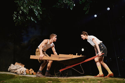 The teenage protagonists, denoted simply as He (Johnny Berchtold) and She (Lily McInerny), meet at a camp celebration with a loud German oom-pah band playing in the background. She is a mousy 16-year-old wallflower, and He is a brash and confident 17-year-old. In their initial flirtatious awkwardness, they trade barbs, calling each other "dummy." At first glance, the couple could be a version of Rolf and Liesl from The Sound of Music transplanted to Yaphank, New York. Over the course of the summer, they continue to work together (including constructing that aforementioned deck), verbally spar, and soon sexual sparks ignite. When this sixteen-going-on-seventeen-year-old becomes something of a dominatrix, however, you can be assured we are no longer in Rodgers and Hammerstein's world. The play is also a far cry from another standout pop-culture reference, the Catskills summer affair presented in Dirty Dancing. In addition to kindling their romantic passions, the rigorous chores and ardent social activities at Camp Siegfried provide the perfect means to set free the characters' German nationalist fervor. She begins politically timorous, insecure in her Germanness and her cultural leanings, but as the summer draws to a close, she is resolved to propagate the Aryan race and has fully embraced fascist philosophies. While He had harbored fantasies of settling out West, he gradually changes directions to go east and fight with the SS and brownshirts. Wohl's play raises interesting questions about the ways in which ideologies take root and flourish, especially among youth. The verdant backdrop helps make the allusions to Nazi propaganda emerge even more insidiously. (Brett J. Banakis's impressive set consists of a rolling hill and greenery, and Tyler Micoleau's excellent lighting helpfully conveys several outdoor and indoor locales around the campgrounds. Brenda Abbandandolo's period-specific costumes and Christopher Darbassie's sound design further assist in evoking a particular historical and psychological milieu.) The play is not, however, without its slow patches, and I didn't quite believe the huge character change and profound language fluency development in the young woman that occurs over mere weeks. I'm also not sure why the teens, who are drawn with such specificity, don't have names. Still, the play is productively provocative, and it breathes life into a fascinating archival footnote. David Cromer's direction generates significant heat between the two performers, and Berchtold and McInerny are marvelously matched in negotiating the shifting desires and alternating power dynamics. These are intensely physical performances as well, so when the lovers talk about painful blisters, bruises, and missing toenails due to harsh labor conditions, it's easy to see why. As I was leaving the theater, I heard one audience member remark to a companion that the play was "way better than that otherNazi teen show." I am fairly certain they were referring to This Beautiful Future, Rita Kalnejais's exquisite piece about a German occupier and a young French woman who fall in love during the height of World War II. Camp Siegfried–and here's where I think I disagree with my fellow spectator–does not have the audacity and sheer theatricality of the other work, but it still offers a potent and timely reminder that hatred and neo-fascism can flourish in our own backyard. Camp Siegfried