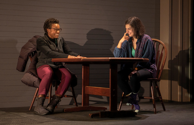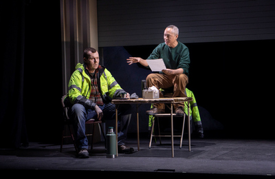 Yet, the standout in this production is Bernstine, who is one of New York's finest actors and is giving a career-high performance. The weight of the world rests on Maiworm's shoulders, and Bernstine beautifully shows the ways in which the character negotiates administrative responsibilities, parenting duties, and her own sexual desires. She obsesses over "heated permeable pavers," a new technology that would simultaneously make wintery streets safer, protect the environment, and save wildlife. The new roads, though, would put the salt-truck drivers out of work. Bernstine brilliantly conveys this administrative and metaphysical conundrum in every gesture, every strained smile, and every effort to not flee a room. When the character says she wishes she could give up her position as Assistant Director of Public Works to be Director of Private Works, there is manifest hopefulness. The production benefits from excellent design by Matt Saunders (scenic), Isabella Byrd (lighting), Sarafina Bush (costumes), and Mikaal Sulaiman (sound). The creative team perfectly captures the familiarity of the salt-dome work room, a suburban home, and the inside of the truck's cabin. Rickety overhead doors, eccentric lighting effects, extra-warm clothing, and wintery street sounds evoke the coldness (both in temperature and perceptions of isolation) and preternatural anxieties that have insidiously permeated Evanston, which could be Anytown, USA. I must confess that I have not been a champion of Arbery's past work. I found his most celebrated play, Heroes of the Fourth Turning, frustrating and perplexing. After seeing Evanston Salt Costs Climbing, I think I need to give it another look. Evanston Salt Costs Climbing