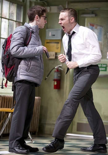 The war between script and presentation is one that's playing itself out on Broadway, too, in another of Stephens's works, The Curious Incident of the Dog in the Night-time. But, as directed and designed, that show is more dazzling than this one. Granted, Punk Rock is set in the library of the Sixth Form of a Stockport grammar school, leaving Cullman, scenic designer Mark Wendland, and lighting designer Japhy Weideman few options but to go oppressively institutional. In its cavernous, shadowy design, complete with yawning wide-open spaces, and half-empty shelves bearing piles of sloppily arranged books, the set ignites your view of the people who use it as otherworldly outsiders, people who don't belong among the other students with whom they must associate. Before a single line is uttered, you already know that you're dealing with people who are not "normal." If that wouldn't be a problem in some circumstances, it is when you're all but demanded to look for the monsters lurking just beneath everyday façades.
