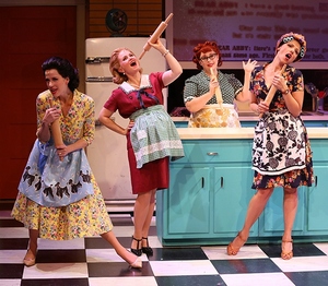 Things start promisingly enough as we settle into the kitchen of Joan Smith (Paige Faure), a tart and smart young woman living in Winnetka, Illinois, in 1957. Every Wednesday, she and her best girlfriends get together to cook, gossip, and just have a good time, and since it just happens to be Wednesday, it's not long before we also meet the perpetually (and, apparently, happily) single Agnes Crookshank (Janet Dacal); the quintessential housewife and mom of four, Dottie O'Farrell (Allison Guinn); and the very pretty, very pregnant, young married Connie Olsen (Autumn Hurlbert), whose delivery date is in three days. Although there's technically a through linecan the four whip up an international menu scintillating enough to win $50,000 in the Betty Crocker cooking competition?it's not much more than a flimsy excuse for dispensing watery period-styled songs; there's a doo-woppy one about Dear Abby, one about the silly rumors they traffic in, one about the joy of cocktails, one about the joy of sex (as seen through the lens of the recently released Kinsey report), and "In Limbo," which crosses emotional confusion with the Trinidad dance craze. It's all peppy (the fine musical direction is by Gillian Berkowitz), but rather unavoidably pointless. This doesn't change even when, of course, secrets are bared, feelings are hurt, and rifts are formed that would take approximately a decade to healsomething that becomes a possibility considering that the second act is set in 1967. At that point, long hair, free love, civil rights, and expanding attitudes have taken over, and the women have not been immune, even though they've changed about as much as the times around them have. Naturally the music has changed, too, with edges of funk and edgier pop leaking into these previously well-ordered lives and forcing them all to see things as they never have before. It's not necessarily a bad idea, even if The Marvelous Wonderettes (its jukebox score notwithstanding) got there first. But it doesn't feel organic. The ladies fit into such tidy compartments, in both decades, that it seems as though Barsha and Levin are more interested in making grand statements about the changing of women's attitudes than telling a story about these particular women. They're more symbols, of perspectives on sex, ethnicity, or tradition, than they are vibrant personalities on their own, and, more crucially, their transformations are not easily believable. Joan, Agnes, and Connie are just too different between the acts, and the explanations for how they've evolved are, at best, eye-rolling. (Don't ask, for example, why Agnes has suddenly become a no-holds barred Latina.) Dottie is a conservative homemaker in both years, and is thus much more interesting, as you're better able to observe the nuances that have come to define her and her relationships. Because the other women become all but unrecognizable, their actual development is harder to recognize, let alone accept. Hurlbert and Dacal give the cleanest, most enjoyable performances, coming across as both the funniest and the most genuine, even if their characters' wackiness stretches the limits of credulity way too far. Faure's ironic approach to her part is a bit too on-the-nose and Guinn's horn-rimmed-glasses-wearing matron verges on (sometimes dips her foot into) caricature, but they're good enough. So are the staging and choreography (by Lorin Latarro), which are hamstrung primarily by the goofy script, and the cozy design (the set is by Steven C. Kemp, the costumes by Dana Burkart, the lights by Nathan W. Scheuer, and the video projections but Justin West) that escorts you softly through an era of true social tumult. That A Taste of Things to Come avoids it in most real ways is a problem even bigger than the show's overall genericnessyou have to break some eggs, and all that, and Barsha and Levin don't. That might be why their most successful songs are the two that are more about introspection than pastiche: "Blessing in Disguise," in which they realize their potential, and the finale, "In Time," in which they realize where that potential may lead them. There's heart in these numbers that's attractive, even moving, in part because of how little attention is called to it. They're just right: done all the way through, but just a tiny bit soft at the center. The rest of this well-intentioned musical, though, is overbaked.