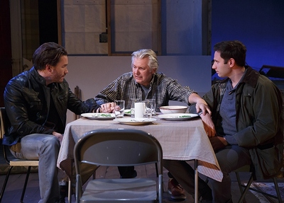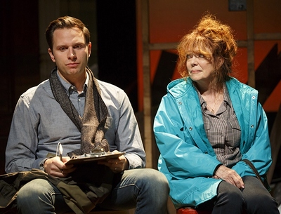 The house, by the way, really is gone. Scenic designer Wilson Chin has filled the stage front to back with debris, except for the bare, wooden framework of a wall to which insulation and sheet rock could one day be attached. Theoretically. This second major storm in two years has everyone spooked and most of the Murphys' neighbors decamping for greener pastures (even in New Jersey). Father Marty is intent that he and his wife Mary (Deirdre O'Connell) stay on the coast, among people they know. Son Sal (Quincy Dunn-Baker), a transplant to Manhattan, insists they move for their own safety. Sal's brother, Brian (Tom Pelphrey), has other matters on his mind: He recently finished up a two-year stint in prison brought about because Sal squealed on him. If the boys' disagreement is the most vicious on display, it's hardly the only one. Bubbling just beneath the surface are intimations of problems between Marty and Mary that this disaster has caused, and her not being openly on his side about staying frays nerves still more. Sal, who feels constantly pressured by Mary about having children and is in rocky straits with his own wife, alternately takes charge and takes to the road, trying to make the decisions he sees Marty ignoring when he's not endlessly criticized for doing so. And Brian, trying to resume a normal life, has taken a line-cook job at an Olive Garden, and is trying to rekindle his adolescent romance with the newly divorced girl next door, Emily (Cassie Beck).