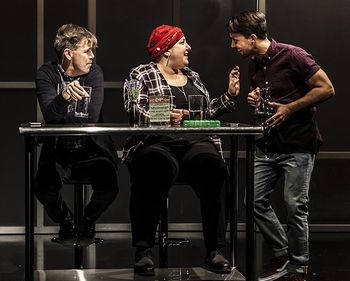 Gerrard handles it all smoothly and honestly, if with a minimum of sticky sentimentality: The characters, particularly Carrie and Steven, are clear-eyed about the options before them, and address them in the proper no-nonsense terms. It's not always pleasant watching ugly truths creep into the ghostlit fantasy in which all these people are living, but Gerrard ensures that even his harsher critiques amusing. (Steven: "You've hired a live-in prostitute!" Matt: "He's not a prostitute." Steven: "Is he paying rent?" Matt, spitting with indignation: "He's saving for law school.") And when the comedy all but fades away, there is sincere heart to be found beneath the thick armor that's been chipped away. You can hide, Gerrard insists, but not forever. Nixon has coaxed impressive performances out of all of her actors, wisely playing up the personalities for which many of them are already known. Cantone is bracingly, if seriously, broad, his Matt obviously adoring everything about the wild life he's living while acknowledging what a rare gift it is. Gets has honed Stephen's neuroticism to a fine point, but applied to it an overlay of sensitivity that makes you see his side even when you'd rather not. McGrath, recently so good in The Legend of Georgia McBride, plays Steven in a constant state of half-collapse that highlights his innate vulnerability and his resulting poor choices. And Atkinson buries a quiet terror within the brash Carrie, forcing you to see her as more than just a victim. Dixon and Francisco Pryor Garaf (as a Steven-eyeing waiter who's always in the right place at the wrong time) are less distinct in their more functional parts, but fine overall. Perhaps the most interesting thing about Steve is how it compares to a strikingly similar play that also just opened, Peter Parnell's Dada Woof Papa Hot at Lincoln Center. Both deal with middle-age gay couples battling infidelity over a number of months, with past expectations and mistakes looming over an even-more-uncertain present. But if Parnell's play promotes an upscale, conservative spin on the topic, Gerrard's works harder to pinpoint the unique difficulties and expectations with gay relationships, if also in a funnier way (though it also gets sadder at points). Those interested in this subject matter would be advised to see both if possible, as the two contrasting arguments, taken together, appear to present a single, rounded picture of the challenges facing gay marrieds today. In any event, everyone will find something to relate to in Steve, as learning the boundaries of our imaginations is a universal experience. Things may not always end happily, but so what? Whether the curtain comes down on a comedy or a tragedy (or, if you will, a Wonderful Town or a Sweeney Todd), the important thing is that the curtain comes down and find our way, however awkwardly, once the lights go up and we're once again seeing the world for what it is and not merely what we'd like it to be.