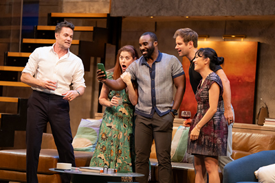 It's a high-stakes cocktail party in a high-rise condo during a lunar eclipse, revolving around a risky phone game among friends–four former fraternity "bros" and three "wives." After gossiping about a recently divorced couple entangled in a cheating scandal, the group agrees to keep their mobile phones on the coffee table to openly share every text and call. A rapid series of secrets unravel, triggered by conveniently timed messages. While O'Hara's swift directorial pacing keeps the momentum going, the scripted confrontations seem contrived to cram in as much vitriol and discord as possible. The simplistic structure sacrifices depth and development. Conflicts escalate, entangling everyone–from daughters to doormen–in a cringeworthy web of grotesque, immoral, and exploitative action. All of this unfolds in a luxe DUMBO condo, with a telescope poised atop its glass terrace, ready for eclipse-watching. Angular spaces in Clint Ramos's bilevel set facilitate cinematic-style scene transitions. The open floor plan is framed by an artificial skyline, projections displaying a candy box assortment of New York City landmarks–Statue of Liberty, One World Trade Center–in a palette that coordinates with the condo's virtual fireplace. Alex Jainchill's lighting emphasizes sleek sterility. Palmer Hefferan's sound design efficiently scores terrace trysts with ambient noise while bar conversations are dominated by phone alerts. Sarafina Bush's costumes feature bro-culture staples and body-revealing feminine ensembles aligning neatly with established stereotypes. While designs don't evoke the dynamism or mood of the lunar eclipse, they mirror the synthetic tone of the plot and characters. In one standout sequence, an inebriated ensemble dance to "Da Butt" from School Daze spotlights the camaraderie and cluelessness among white privileged partiers Rodger (Neil Patrick Harris), Frank (Michael Oberholtzer), Brett (Garret Dillahunt), Eve (Jane Krakowski), and Claire (Debra Messing). At the same time, there is an unspoken sense of alienation shared between Hannah (Constance Wu), an Asian-American woman newly married into the group, and Logan (Tramell Tillman), a Black queer man who has spent years masking his own difference to blend in with the "bros."