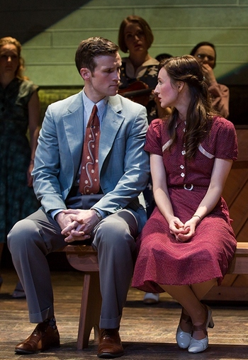 Joe fares little better with his friend Charlie Townsend (George Abud) or Emily (Jane Pfitsch), the long-suffering nurse who eventually becomes an ally; so much dialogue has been cut in reducing the show from three hours to 90 minutes, and the staging so abstruse (characters deliver whole scenes leaning against the rear wall and looking beyond the stage, while awash in Jane Cox's highly unflattering lights, so you can neither see them nor understand how they're communicating), neither has an impact. But both are crucial, as the central journey is of Joe's leaving one community and forming another, a process in which Charlie and Emily are supposed to be instrumental. (In fairness, Doyle has changed the ending so this no longer occurs. But that used to be the point.) The second difficulty is with the dancing: There isn't any. If it's unrealistic to expect a small mounting like this one to recreate or approximate De Mille's full landscape of choreographythere are at four full ballets, and almost everything else is awash in "incidental" dancingmovement is vital to not just the storytelling but the atmosphere, which must be an original cosmos of personal discovery for Joe that involves walking as a toddler, getting married, and experiencing dissolution and redemption. Doyle's staging is leaden, a lot of walking in circles and, sometimes, turning in circles, when the actors aren't frozen in place. But if nothing gives the show locomotion, inertia demands it just sit there. There are other missteps. The constant reusing of actors in both parts and ensemble makes following things confusing. (One character joins the chorus immediately after dying, for example.) The colorless design of Doyle's set, which looks like the side of a barn with a barren field painted on it. Mary-Mitchell Campbell's hokey, folksy orchestrations (almost all stringed instruments, including banjo and guitar) that make no tangible distinction between Here and There. Dan Moses Schreier's sound design, which is overdone throughout but at its worst in the deconstructed final scenes when everyone sounds like they're intoning words in a cave. Then there's perhaps Doyle's worst-ever use of actor-instrumentalists: Davis playing her violin almost nonstop, even while speaking or singing; Jessica Tyler Wright also plays one as Joe's mother, Marjorie, setting up an intimate connection between two characters who must be contentious; Abud crooning over and over again to his cello; or Ed Romanoff, as Jenny's contrarian father, joyously accompanying himself on guitar when he's supposed to be complaining about his daughter's impending nuptials. And, for that matter, the performers in general, who from vets in small roles like Malcolm Gets (drastically unconvincing as Joe's caring but home-minded father) and Alma Cuervo (game as Grandma Taylor) to the misused and vacant Elder and Davis to the busiest ensemble players convey no humanity, despite the libretto's insistence on its importance. Ultimately, few of them matter. Divorced of its drama and rhythm, Allegro has no chance of overcoming its own structural peculiarities, let alone a smug and stuffy second half that reads as more a condemnation of the rich and urban than a society that's at odds with Joe's makeup. Though this production gives hope as few others have that Doyle's tactics might bear fruit with the right property, in trying to tame this show he's just made it more unruly and impenetrable. After all, its underlying philosophy of existence is described in the lyric "Brisk, lively, merry, and bright." This production is never any of those things; but those words are in the title song, and cutting that, however appropriate, is apparently one step too far for the otherwise do-anything Doyle.