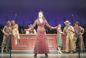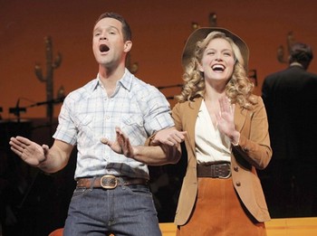 What is there to say about "Embraceable You," "I Got Rhythm," and "But Not For Me" that countless cover artists and, much more importantly, human hearts and souls haven't rhapsodized about endlessly for 79 years? These are classics for the best of reasons, the first and third because they respectively tap into the swaying lusciousness of romance and the utter deflation of sudden heartbreak, and the second because its relentlessly pounding optimism calls your spirit to action as much now as it did during the Great Depression. This is less music than a part of the American psyche, and to hear the songs as they were originally intended, with Robert Russell Bennett's Broadway-busting orchestrations, is to understand the wavering essence of musical comedy immediately post-Show Boat. Maybe "Bidin' My Time," "Could You Use Me," and "Sam and Delilah" are more second-tier, but they're remarkable in their own rights, circumscribing Southwestern romance, fleet-footed courtship, and semi-steamy sex play no less expertly than the three Hits to End All Hits. The rest of the numbers, even if still lower on the scale, aren't quite slouches, either. Who could ask for anything more? Because Encores! is, at its core, all about the music, one must be thankful for the opportunity to be exposed to this score in as close as we're likely to get to its natural setting. But this time around, it isn't just the primary thing - it's the only thing. David Ives's "concert adaptations" are familiar to any veteran Encores! audience member. Ives never gives you the full book - or, usually, anything close - but through his reductions he usually maintains some semblance of sense and structure, guiding you from song to song in a way that gives you a vague feel for the story that might once have existed. Not so here. Aside from a few lines identifying Danny Churchill (Chris Diamantopoulos) as being sent from New York to Custerville, Arizona, to cure him of his being "girl crazy," we know nothing about the male lead. Molly Gray (Becki Newton) is the local mailwoman with whom he falls in love at first sight and not much more. A scene or two later, he's running his own dude ranch-cum-nightclub and proposing to Molly. Then an old friend of his, Tom Mason (Gregory Wooddell), arrives, announces he's in love with Molly too, and transports her to Mexico - with Danny and the rest of Custerville to follow.