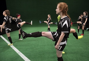 Wonderfully acted by a tight-knit ensemble, The Wolves is about the things we miss when we fail to pay attention beyond the random (albeit entertaining) chit-chat and gossip of young women, in this case the members of a high school girls' soccer team. And it is important that we do pay attention, because the most significant moments emerge quietly and naturally as part of the sometimes overlapping dialog that fills the air while they are doing their pre-game stretching, running, kicking and other exercises over the course of a single season. These conversations might simultaneously encompass any number of diverse topics, such the one that kicks off the play; while one group of girls is discussing the atrocities committed by the Khmer Rouge in Cambodia, another is debating the relative merits of menstrual pads and tampons. It's a funny juxtaposition, of course, but don't be lulled into thinking this is merely a lightweight comedy or a gentle satire about the trivial lives of adolescent girls. Indeed, the play has gathered some real gravitas in the year since it had an initial run in a production at The Duke, driven by a newly-awakened national awareness about the sexism and harassment that women experience on a regular basis. What might have been seen (or even missed) as a throwaway line a year ago takes on a whole new weight, like the remark one of the girls makes about "Coach Neil, the creep who asked us to scrimmage in our sports bras." Perhaps the girls can shrug it off, but consider the fact that we are the ones who have taught them to shrug it off, not to mention the implications of allowing such a man to work unnoticed and unchallenged in a school setting. One of the intriguing things about the play is that we don't hear any of the girls mentioned by name for most of the evening. Instead, they generally refer to one another by the numbers on their uniforms, an important distinction that seems to serve the purpose of emphasizing the team as a whole over the individual players. It also underscores the universality of the things that matter to them, from worries about their future, to eating disorders, to sex. They speculate as to whether one of them has had an abortion, we learn that one has narrowly escaped from an unwanted sexual encounter, and another seems to be examining her sexual orientation. There is also resentment over the fact that the boys' team has a former professional soccer player working with them, while they are stuck with a "washed-up pudgeball who spends games at the vending machine." It's all out there, and it is up to the girls to figure things out without much assistance from disengaged parents, teachers, or coaches. In fact, when the only adult shows up in the last few moments (Mia Barron as a distraught soccer mom), hers is a disturbing and disruptive presence, one that can only be overcome by the girls forming a pre-game huddle and repeating their team's cheer, over and over and louder and louder: "We are the wolves. We are the wolves. We are the wolves!!!" Commendations all around for this original play that captures so well the secret world and voices of these high school girls. Director Lila Neugebauer has done a splendid job of building an authentic team out of her young performers, all but one of whom has been with the play since its initial production. While all that we see takes place in Laura Jellinek's monochromatic pre-game practice space, our experience is greatly enhanced by Lap Chi Chu's lighting and Stowe Nelson's sound design, both suggestive of the actual soccer matches going on just beyond our view. Even the pre-show music smartly incorporates songs performed by women singers the girls would be listening to, including (if I'm not mistaken) Demi Lavato, Lizzo, and Taylor Swift. Most of all, however, kudos go out to the girls of The Wolves: Susannah Perkins, Paola Sanchez Abreu, Jenna Dioguardi, Sarah Mezzanotte, Midori Francis, Tedra Millan, Samia Finnerty, Brenna Coates, and Lizzy Jutila. Long may they howl!