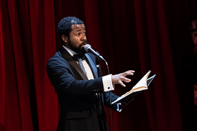 Ufomadu enters through the audience, spiffy in a fedora, scarf, and overcoat hiding a tux. What he does next, and for the next 75 minutes, isn't easily characterized, but it's hilarious. Immediately ingratiating himself with the crowd, Ufomadu affects the persona of a slick, mid-century TV white guy, maybe a Johnny Carson or a David Susskind. His drawn-out white-guy elocutions are flawless, and even more drawn-out and flawless when he briefly switches to JFK-esque Bostonese. Like Tatarsky, he breaks the fourth wall, but in a much more benign, less pushy way. And he lapses into instant absurdity, funnier through his delivery and Nemuna Ceesay's direction than can be conveyed here: "I understand that many of you out there are here tonight. By show of hands, who's here?" Or, "What's everybody doing after this? I don't mean the show, I mean existence." From there he flies off into unrelated tangents that somehow hang together, whether reading the opening of "Moby Dick," extending Stanislavsky's "there are no small parts, only small players" utterance into an improvised essay of at least 400 words, or leading a singalong of some unexpected songs that you surely will know. Merrily parodied along the way are cheap audience-pleasing tactics of the "give it up for yourselves!" variety, audience one-on-ones of the sort Carson used to do, and needless nods to religion: "Happy Saturday, by the way, to those who observe." The show-biz platitudes pile up, recalling the less inclusive, more white-bread America of decades past, and gain force as they do; one lady down the row from me was really losing it, and I can't remember the last time I laughed so much in so short a time. "I'm not a comedian, but I play one on stage," Ufomadu says. He sure does!