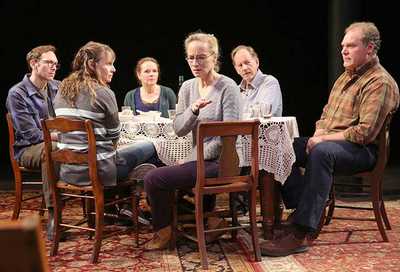 Nelson's series has been a unique theatrical experiment that's followed the same group of characters played by (mostly) the same incomparable actors as they've analyzed the 2010 midterm elections, the tenth anniversary of the September 11 attacks, and the presidential election that returned Barack Obama back to the White House. Nelson, who's directed as well as written all the shows, has crafted a vibrant, genuine family with a long- and deep-running history that he's now able to escort to a graceful close. But he does so with the most overt emotionalism and undisguised sentimentality yet, which does not sit easily on these people. Not that the Apples are that difficult to understand. What's long made them compelling is both how average they are and how remarkable Nelson has revealed them to be once he's peeled away their externalities. Even so, they have not traditionally let their insides show at the slightest provocation; the easiest way to get at their darkest secrets has always been to wait for them to talk about something, anything else. So to see them so effortlessly reduced to tears, or at least struck dumb by the weight of their burdens, does not automatically ring true, even if confronting mortality is no longer optional. Kennedy's death and the hoopla surrounding its new historical milestone are only the sparks. The fuel is provided by Adam Platt, Marian Apple's unseen ex-husband, who's in the final stages of dying upstairs at Marian's sister Barbara's house. Numerous relatives have gathered there recently to pay their final respects to the living Adam, and to learn the memorial service he's spent his last conscious days planninghe's leaving nothing, from the music to what his sister is supposed to say while scattering his ashes (nothing), to chance. The Apples, who also include Albany lawyer Richard and third sister Jane, plus Jane's actor-boyfriend Tim, take this philosophy to heart. After all, it correlates almost perfectly with the attitude they need for dealing with their Uncle Benjamin, whose deteriorating mental state has been the most tender through line between all four plays (his memory is still shot, and he visits from the assisted-care facility once a week or so), so they all expect to need to face the matter again sooner rather than later. This gives Nelson a good excuse to probe what existence means, and touch on the matter of the personal legacies we leave behind. But if in its first 75 minutes or so Regular Singing generally comports itself, if lacking the layers of intricate detail that have made the Apples so unbearably real, Nelson lays it on overly thick toward the end, giving into the impulses he's until now been able to outline in neon what he's previously only suggested. So the sextet muses on the nature of death, how the once-sleepy hamlet of Rhinebeck has grown into unrecognizability, reminisces about where each of them was on That Day in 1963, and so on. It's shockingly conventional, and not at all powerful: These don't sound like the long-accepted nuances of their lives that would never, ever be aired outside of Barbara's walls, but backward-glancing displays of loss indistinguishable from any others that have flooded news shows and websites over the last couple of weeks. They're trying to participate in Camelot, rather than translate it into their own language, and in this atmosphere that approach feels false. Thankfully, it's all that does. Nelson's direction remains beautifully paced, tightly focused, and filigree-free, thriving on the knee-to-knee discussions that thrust you right into Barbara's living room (designed, as were the costumes, with elegant simplicity by Susan Hilferty). And the acting more than sustains this impeccable standard. Though I admit to being disappointed that J. Smith-Cameron and Shuler Hensley have not come along on this final trip as Jane and Tim (Smith-Cameron's in the Irish Rep's Juno and the Paycock, Hensley in No Man's Land and Waiting for Godot on Broadway), Sally Murphy and Stephen Kunken are superb substitutes, if hardly carbon copies of the performers they're replacing. Murphy is more of an eternal ingénue, softer and more optimistic, but Jane is still a dyed-in-the-wool realist; and Kunken's rational, intellectual spin on Tim is a comforting take on a man who's finally allowed to come into his element. But Maryann Plunkett (Barbara), Jay O. Sanders (Richard), Laila Robins (Jane), and Jon DeVries (Benjamin) conclude their from-the-beginning portrayals flawlessly, and fill out the final recesses in the outlooks and relationships that have so defined these people. Sanders and Robin, tasked most heavily with demonstrating how to continue to live after mourning the dead, have the most complex assignments this time around, and make the strongest impressions. But Plunkett's quiet strength and DeVries's sparkle-eyed innocence are essential: one who goes on at any cost, and one on a particularly unstoppable march to finality. The lesson of Regular Singing, of course, is that none of us can avoid Kennedy's and Adam's fatespresidents, schoolteachers, and actors alike will eventually succumb. But Nelson has never needed to flat-out tell us to make the most of the love and discussions we can have while we're here. So when, in the meta finale, Plunkettnot Barbaraturns to us and intones, "It's those days together that remind us why we live. Or maybe it is... how. How we live," it's as if for the first time we're hearing too much: an explicit conclusion to tetralogy where everything has always been implicit. It's not the best note to go out on. But if it's the price for peering so deeply into the Apples' souls since 2010, it's one that's probably worth paying.