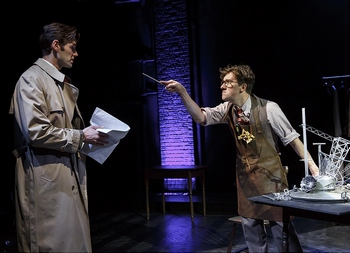 Jones, an Orange Is the New Black writer whose stage work includes Verité and The Coward (both for Lincoln Center's LCT3 emerging artists program), has a knack for weaving off-kilter comedies from seemingly sensible materials, a skill that suits him well here. Because, on the face of it, there's nothing so outlandish about a war of wills between two creativity-starved 1930s fashion designers. One, Sam Greevy (Carson Elrod), believes that clothing should accentuate beauty, inspire the senses, and elevate mankind (really, womankind) to its uppermost ideal; while the other, Paul Roms (Matthew Saldivar), considers it far more important that everyone be able to wear his clothes and feel comfortable rather than restrained, even if the aesthetic is pure frump-fest. That Paul pursues his goal by, uh, donning a time-traveling hat that lets him visit 1998 and pilfering from the closet of an average urban adolescent is... okay, it's not beside the point at all. Sam's struggling to operate within the strictures of his time and training despite Paul "inventing" increasingly bizarre get-ups (the sweatshirt! the track suit! sneakers!) that capture the imagination of those still grappling with the effects of the Great Depression is where Jones gets nearly all of his story and humor. Some of the remainder comes from the attendant aspects of the narrative, such as Sam's on-the-down-low relationship with fashion reporter T.B. Doyle (John Behlmann) or the mechanics of how the "brilliant, overweight scientist" Dr. Cromwell (Remy Auberjonois) created the hat and why it's responsible for the menacing metal orbs that have suddenly begun floating in the skies of New York City, but everything is handsomely intertwined.