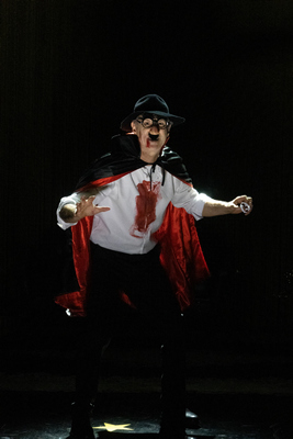 In Golyak's adaptation, the setting is a late-night comedy studio at Christmas time (emphasizing the play's dominant Christianity), and the show's host, Antonio (T.R. Knight), abetted by a hapless assistant stage manager (Stephen Ochsner), warms up the audience. For tonight's episode of "The Antonio Show," the actors will be broadcasting a live performance of The Merchant of Venice. Antonio explains that historically the work is considered one of Shakespeare's "problem plays," and as a way to address the inherent difficulties, the team has done some "research" to make the play more accessible for modern audiences. As he also elucidates, Shakespeare was influenced by the broad comedy and stock characters of commedia dell'arte, which justifies their intention to reinterpret the play as a comedy, "full of laughs and young people in love." What follows is a drawn-out, two-hour farcical sketch with missed cues, faulty microphones, and unmitigated overacting and mugging. Songs are interpolated, Shakespeare's sonnet "My Mistress' Eyes Are Nothing Like the Sun" is delivered as a hip-hop number, and the audience is instructed to applaud and boo throughout. This is The Merchant of Venice as if enacted by Alan Swann and the "Comedy Cavalcade" company from My Favorite Year or by the Rude Mechanicals' staging of Pyramus and Thisbe in A Midsummer Night's Dream. Prior to the show, audience members receive a printed summary of Shakespeare's play, and midway through the first act there was a rustling of paper behind me as people tried to figure out what was going on. Allusions to "The Dating Game," "The Bachelorette," and Love Actually may resonate with contemporary audiences, but they don't clarify the plot. The narrative's comprehensibility is not helped by offering the play's exposition by Antonio and Salarino with two hand puppets manipulated and voiced by Knight. The other characters are similarly exaggerated. Shylock (Richard Topol), imagined as a vampiric, melodramatic villain, appears wearing black frames, bulbous nose, and bushy eyebrows and moustache (commonly called Groucho glasses). He is covered in (presumably, Christian) blood. Portia (Alexandra Silber) is delineated as a vapid, Barbie-like figure, and her suitor Bassanio (José Espinosa) is a studly Ken-type given to wearing tight Adidas shorts and no shirt. Shylock's daughter Jessica (Gus Birney), who is in love with Lorenzo (Noah Pacht), is a libidinous teen who acts out her sexual fantasies with her dolls. The genius of Shakespeare's plays is that they may have incorporated the commedia elements, but they push beyond them, providing layered and rich characterizations. The play within the play also slices and dices Shakespeare's original, cutting whole scenes and moving much of the fifth act to precede the climactic trial scene, which occurs in the fourth. Yet there are hopeful and ephemeral moments of what-could-have-been if a more subtle approach had been taken. For instance, when Topol removed his Groucho glasses and declaimed a searing "Hath not a Jew eyes?" monologue, I longed to see how he might have approached the part with more complexity. The final image, which powerfully reveals the play's problematic and hotly debated underlying antisemitism, recalls the potent imagery Golyak brought to Our Class. (The creative team, including scenic designer Jan Pappelbaum, costume and properties designer Sasha Ageeva, lighting designer Seth Reiser, and composer/ sound designer Fedor Zhuravlev, contribute to the over-the-top and anarchic approach in which more is more.) Most of the visuals, while underscoring the intellectual discourse around the text, lean into the silliness. For example, Shakespeare scholars have pointed to the homoerotic relationship of Antonio and Bassanio, and in this production, the male puppets are depicted in an act of fellatio. Other scholars have pointed to the play's radical gender dynamics and the empowerment of women when Portia assumes the identity of Balthazar, the lawyer, who frees Antonio from his pound-of-flesh contract. The gravitas is lost (and perhaps that's the point) to have Portia wearing a well-muscled Superman costume and assisted by her confidante Nerissa (Tess Goldwyn) dressed as Batman's Robin. Unfortunately, Shakespeare has not fared well on the New York stages this fall. Currently on Broadway is a flashy and fast-paced Romeo and Juliet that is geared to a Tik-Tok sensibility. Kenneth Branagh's King Lear, now playing at The Shed, is heavily redacted and tonally confusing. At the risk of sounding like an elitist snob, the Bard deserves better. And so do we. The Merchant of Venice Through December 22, 2024 Arlekin Players Theatre Lynn F. Angelson Theater, Classic Stage Company, 136 E 13th Street Tickets online and current performance schedule: OvationTix.com