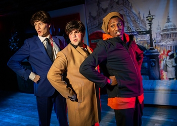 In truth, Off-Broadway musical lampoons are not a new phenomenon. Some of the most successful small-budget shows of the 1950s and 1960s took aim at popular films, such as Nelson Eddy and Jeanette McDonald operettas (Little Mary Sunshine), Shirley Temple movies (Curly McDimple), and Busby Berkeley extravaganzas (Dames at Sea). Rather than parodying film genres, however, the more recent entries tend to focus on single, well-known titles. The tone and style of these shows are closer in approach to a Carol Burnett sketch or a Mad Magazine movie parody. At first glance, Love Actually does not seem to be a prime candidate for spoofing. Though popular, the film has not achieved (as far as I am aware) cult status, nor does it have the nostalgic campy appeal of some sitcoms and notoriously bad movies. Because of its holiday theme, though, it is broadcast ever year at Christmastime, though it may not be a holiday tradition in the vein of, say, It's a Wonderful Life or A Christmas Story. For the uninitiated, the film is constructed of ten different plotlines, each involving a "love story" in its myriad forms. Set in London, some of the characters include, for instance, the newly installed British prime minister and his awkward but charming assistant, a dutiful housewife who suspects her husband may be cheating on her, a pair of naked body doubles who meet on a film set, and a hapless videographer who is in love with his best friend's wife. One of the movie's pleasures, and there are many, is watching how the stories intersect with each other. The challenge of adapting the material into a musical is in managing the sheer number of characters needed to complete the collage. This was also no doubt the appeal for bookwriters and lyricists Bob and Tobly McSmith and composer Basil Winterbottom. (The McSmiths, incidentally, have practically created a cottage industry of musical parodies with, to name a few, Friends, The Office, Full House, and Showgirls.) There is a throng of well-known British actors playing all of the characters in the movie, but the onstage show has a cast of six performers in total. In performance, silliness ensues as ensemble members make lightning-quick changes to advance the narrative threads. (Dustin Cross designed the whimsical costumes and wigs.)