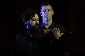 The highly imaginative 70-minute work is an adaptation by Anthony Black of a short story by Yann Martel, an author best known for his hallucinatory novel Life of Pi. It features Mr. Black, who also co-directs with Ann-Marie Kerr, as the narrator, with violinist, vocalist, and composer Jacques Mindreau performing classical and original music in counterpoint to Black's storytelling. How Mr. Black's character and the musician came together at a special time in the narrator's life is what drives the central plot, and it is best left as a gift for you to unwrap as a member of the audience. But what fascinates most is the portrait the storyteller paints of himself as a young man, a would-be writer who was "obsessed with words," someone who will (and does) rhapsodize over Joseph Conrad's use of the semicolon. But it is his unexpected discovery of music as another form of expression, especially through a new piece that thrills him to the core, that becomes the transcendent moment of his life. The production begins with Mr. Mindreau entering the dimly lit set, which is covered in dust and broken bits of plaster, along with a few scattered folding chairs. He is carrying a flashlight, which he sets upright on the floor so that the light shines up on him. He doesn't speak, but he proceeds to play the violin he has been carrying. You might get the impression, as I did, that this is someone who had once played in this performance space, which subsequently was damaged in a war. As it happens, war is a significant thread that runs through the work (the musician is a vet), but it's dealt with obliquely, raising many questions along the way without answering any of them. All told, One Discordant Violin is a decidedly literary work, an allegory that becomes accessible in its translation to the stage thanks to Mr. Black's storytelling skills and Mr. Mindreau's lovely performances of Baroque and original compositions written by him and the play's sound designer Aaron Collier, a master at the live looping that brings additional layers to the music. Projections designed by Nick Bottomley, and the evocative lighting, also by Bottomley with Anna Shepard, add greatly to the overall effect. Remove these, and you are left with a lightly staged retelling of a story with a short arc aimed at capturing a singular moment in the narrator's life. But all of the elements of stagecraft come together in a way that blends the ethereal and the mundane into a fascinating theatrical event.