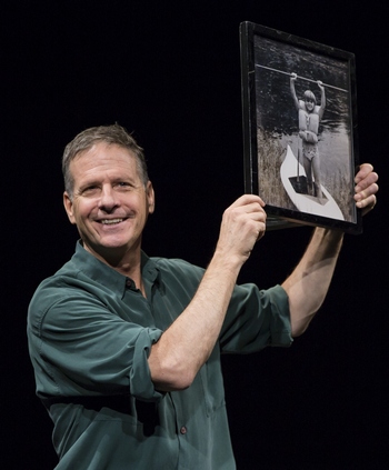 The play is also very funny. The first part of the show transplants the audience into the world of Catholic parochial schools, and it evokes the moments in childhood when adults and their world seem so imposing, silly, and absurd. For young Marty, most of these adults are religious personnel. For instance, there is a buck-toothed singing nun, a nun who teaches cursive using the rhythm method (that is, through musical tunes), and a host of forbidding and foreboding sisters. He also recounts a lesson from a German-Irish priest about sex for solely procreative purposes, and only after one has received the sacrament of marriage. In each drop of God's gift of the Seed of Life, the priest instructs the young boys, there are a thousand hopeful Catholics. Non-procreative sex, the priest warns the perplexed students, is an offense against God and constitutes a grave mortal sin. The future of the Catholic Church, after all, is at stake. Grammar school reveries soon give way to adolescent nightmares and adulthood reckonings. The Tricky Part moves back and forth in time, and Moran describes in devastating detail his confrontation with his abuser and the events that obliterated his innocence. Thirty years after a camping trip in which Bob, a thirty-year-old camp counselor, molested the young Marty, the images are indelible. Moreover, the anger and pain are no less acute, prompting Moran to shout at his assaulter, I was a child and I did not have consent to give! Directed by Seth Barrish (who is currently represented on Broadway with his direction of Mike Birbiglia's marvelous solo show The New One), Moran is an ingratiating and compelling narrator. Now in his fifties, Moran retains a boyish quality that makes him even more sympathetic. Theatregoers do not have to look hard to see his alter ego, the scared and confused twelve-year-old trying to make sense of the incidents that plunged him into bouts of depression and near suicide. Most importantly, Moran is a gifted raconteur with a talent for making the audience lean in closer even as they want to pull back when the memories become so excruciatingly personal and disturbing. Indeed, the strength of the play stems from its simplicity. Except for a stool and a small table, the playing space is empty. Late in the play Moran reads his account from a book in which he had recorded his memories of the most emotionally difficult events. Figuratively, the storyteller gathers his listeners around a campfire (suggested quite persuasively by Elizabeth Mak's lighting), and the effect is chilling. Moran begins the evening by displaying a photo of himself at twelve years old. Wearing a bathing suit and lifejacket while standing in a beached kayak, the young Marty holds a huge oar above his head. The child looks small and vulnerable compared with the bigness of the Rockies in the background, but with the hoisted oar, he also appears confident and victorious. The image conveys the paradoxes of childhood, and the play effectively toys with the ways in which an individual evades, confronts, and reinterprets the past with the hope of forgiving oneself and those who have done her or him harm. This act of grace, as Moran would say, is the tricky part.