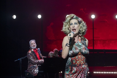 Justin Vivian Bond and Kenny Mellman have performed as Kiki and Herb since the early 1990s, and in New York City alone they have appeared both on- and Off-Broadway, at Carnegie Hall, and Joe's Pub. After a rather lengthy hiatus and solo pursuits, the duo are back together, and their Brooklyn reunion is exactly what we need in these fractured and uncertain times. Structurally and stylistically, SLEIGH is similar to their previous productions. Pianist and backup singer Herb (Mellman) accompanies Kiki (Bond) as they present ingenious song pairings and mixings, such as a frenetic Christmas medley that combines "Sleigh Bells," "God Rest Ye Merry Gentlemen," Radiohead's "Creep," and concludes with a deeply ironic "Jesus Loves Me (This I Know)" There are also outrageous interpretations of familiar songs, and one is not likely to hear "We Wish You a Merry Christmas" in the same way after experiencing Kiki's brutally angry and confrontational version. Yet, there are also moments of real emotional heft, and Bond's cover of Brandi Carlile's "The Joke" is sensational. Defiant and steely in Brandon Stirling Baker's pastel-hued lighting, Kiki offers a powerful anthem for those who have been "dressed down" and had "dirt kicked in their faces." And while performing a lovely and plaintive "Under the Milky Way" by The Church, Bond summons the vulnerability and emotional rawness of Billie Holiday. SLEIGH also builds on Kiki and Herb's backstories, family dramas, and a (literal) sacred-cow narrative that audiences have come to expect in the between-song monologues. Downing glass after glass of Canadian Club, Kiki shares childhood memories of the "Institutional" where she, who had been removed from her mother's home (by her mother!), and Herb, a foundling, first met in 1934. She also recounts an uproarious story from the 1950s about their friendship with Sylvia Plath, who was, according to Kiki, something of a "drama queen." Kiki wasn't surprised to hear about the poet's eventual suicide, because, come to find out, Plath made a "party game" of putting her head in an oven. As audiences might also expect, Kiki provides biting and exceedingly dark social commentary. Referring to current circumstances (and claiming a new definition of the term "superspreader" for herself), she reminds us that this isn't her "first time at the pandemic rodeo." Looking to the audience with mild disdain, she says, "The only people we liked died of AIDS." Mellman also has opportunities to show off his comic gifts and musical expertise. When Kiki changes from a Christmassy frock to a sequined dress that is draped in feather boas (Marc Happel designed the wonderfully garish and Vegas-like costumes), Herb has his chance to shine. Performing his own medley, which includes "If I Were a Dreidel" and Springsteen's "I'm on Fire," he is endearing in his affability and innocence. There is also a hint of creepiness as he plays up the subtextual allusions to pedophilia in Springsteen's lyric. The triumph of the show (as with earlier works) is the way in which the material and performances move from delicious tastelessness to biting satire to affecting wistfulness. Some people may take offense by Kiki's take on the Christmas story, calling Jesus a "rape baby," for instance, since the Bible does not refer to Mary's "consent" to become impregnated. But it is hard not to be moved by the periodic (and unspoken) tributes to Stephen Sondheim throughout the evening. In Herb's nearly constant underscoring, perceptive listeners will notice riffs and phrases from scores like Sunday in the Park with George, Company, and Follies. In addition, one of the encore songs is "Send in the Clowns," and it is a reverent and stunning rendition. Kiki gleefully announced that last month she turned 91, but she has the energy and gams of someone decades younger. Kiki and Herb are perpetually on the comeback trail, and perhaps with the huge success of SLEIGH, Bond and Mellman will keep the nonagenarians back in the spotlight where they belong.
