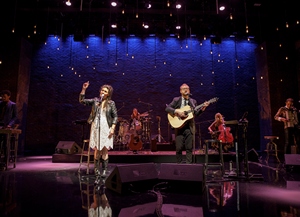 To be sure, Hundred Days is brimming with talent. It's been slicky designed by Kris Stone (set & props), Andrew Hungerford (set and lights), Sydney Gallas (costumes) and Nicholas Pope (sound), and it's been cleverly choreographed by Sonya Tayeh with understated direction by Anne Kauffman, whose recent work on Mary Jane at NYTW was a triumph! Additionally, The Bengson's family band, who perform Hundred Days's hybrid score of alt-indie-folk-punk songs with verve and enthusiasm, consists of Colette Alexander (cello/vocals), Jo Lampert (accordion/vocals), Dani Markham (drums/vocals) and Reggie D. White (keyboards/vocals), are all terrific and boast substantial performing credits of their own. But Hundred Days's story, written in conjunction with Sarah Gancher, can't support a 90-minute drama even when it's shoehorned into a "concert musical" framework. Its autobiographical plot focuses on the three-week period between the time Abigail and Shaun met at a party and subsequently got married. Upon meeting it's love at first sight and, after breaking up with her fiancée, Abigail immediately moves in with Shaun in his tiny Astoria apartment. Shaun is excited but has to break the news to his childhood friend Max that Max can't move in with him anymore. Unfortunately, Max is already in transit driving across the country with his belongings so that friendship doesn't end well. (But they sing a song about it so it's ultimately okay.) Everything's going well for the happy couple. They pour out their emotions sitting in diners and take long walks together wherein they plan their future and kick leaves. Then they decide to form a band together and do, but on the way to their first gig they rear end a UPS truck and Shaun is hurt. The accident triggers a long-festering dream of Abigail's that she's going to fall in love with a man and marry him, only to have him die suddenly after a hundred days. It paralyzes her and causes her to question everything in her life. She bolts the scene of the accident and, later, after they've come home from the hospital, she bolts their Astoria apartment. Shaun wakes up and goes looking for her, eventually finding her on the tip of Coney Island. They eventually decide to cram a lifetime of living and memories into one hundred days to help Abigail move past her fear of committing to their relationship. If this sounds like a bore, it is, despite the fact both Abigail and Shaun Bengson are charismatic performers. There were many times during Hundred Days I had to stifle the urge to yell "who cares?!" at the stage. This is the kind of emotional psycho-babble you foist on your therapist, not on a paying audience. Containing lots of foot-stomping jigs and plaintive ballads, the Bengson's score is often tuneful but it's lyrically banal. Almost every song is a repetitive 4-chord progression saddled with repetitive lyrics that will strike the believers as introspective but will register as pretentious to the detractors. Amidst all the endless talking in Hundred Days, however, is a beautiful moment of stagecraft courtesy of Kauffman and Hungerford. Salt is a recurring theme in Abigail's back story and, through thin columns of light, salt (well, probably white sand) is poured creating a dazzling visual effect. If only the rest of their story could have been as compelling.