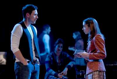 This is because writers Enda Walsh (who wrote the libretto) and Glen Hansard and Markéta Irglova (who wrote the music and lyrics, and did for the movie as well), despite daring to diverge some from their source, have not made their theatre piece as thoughtful and serious as what they're adapting. The foundational relationships and plot points may be the same, but they've been so simplified and flattened for today's audiences and budget-conscious production mindsets that the considerable charm the conjured onscreen has all but evaporated. It's easy to see the genesis for their choices. The film, made on a shoestring budget and at best informally scripted (by John Carney, with improvised additions from the actors), is full of gently prodding ideas and unsettling silences that can toe the line a bit too much between characters who don't know what to say and artists who don't know how to say it. More concrete dialogue, and firmer foundations for both the Dublin guy and the Czech girl who fall in awkward love during a brief but intense collaboration on his musical demo disc, would help crystallize the work's intense perspective on love that can'tand probably shouldn'tbe. All the seeds, however, are there, and quite moving even in their raw state. But rather than make small adjustments to Carney's ultra-lean screenplay, Walsh has manhandled and inflated it beyond the boundaries of mere clarification. By expanding and vulgarizing the characters that surround the unnamed Guy (Steve Kazee) and Girl (Cristin Milioti) at the story's center, Walsh has diluted the romance that was its entire reason for being. As a result, you lose sight of what drives themand, worse, what threatens to drive them apart. These changes come under the questionable banners of both "concept" and "comedy." Director John Tiffany has staged the entire show on a set (by Bob Crowley, who also designed the costumes) that doesn't just look like a pub, but is a pub: Audience members can (and are encouraged to) buy drinks there before the show and at intermission. The preshow festivities also involve various members of the cast, all of whom additionally double as the show's band (on guitars, celli, violins, accordions, and so on), singing various songs, with the street-musician Guy the last to appear. If the creators believe he is no better than a random voice in the alcohol-fueled wilderness, how can and why should we think differently? Likewise, laughs emerge from moments of dishonest stagecraft. For example: During their first meeting, the Guy mentions he fixes vacuum cleaners, the Girl claims she has a Hoover in need of repair, and someone slides her one from offstage. Yet this violation of the theatrical reality of their still-burgeoning union only further convinces us that nothing is to be taken seriously. When Billy (Paul Whitty), the owner of the music store where the Girl routinely plays pianos because she can't afford one to buy, starts making karate-chop stances to show his protectiveness; the bank manager (Andy Taylor), from whom the two try to secure a loan to pay for studio time, croons horrific lyrics while strumming his guitar; or the girl's roommates are pressed into band service for which they're comically unqualified, it's clear Walsh's and Tiffany's goals are not to merely unlock what was missing, but to pander and condescend to audiences in pursuit of "entertainment." The good news is that Hansard and Irglova have left their songs mostly alone, both in their content and their presentation. The movie thrived on the way diegetic performances magically emerged from, and yet related, to these people, and onstage the score retains the same basic quality. If none of the compositions quite reaches the heights of "Falling Slowly," the Guy and Girl's deceptively passionate (and Academy Awardwinning) "first date" in the music store, they all contain a gritty yet gorgeous emotionalism that sounds as if it really did emerge from the urgency of the lonely streets. The expansion of themes from some songs into full dance numbers (choreographed by Steven Hoggett) spoils some of the effect, but this happens rarely. Both Kazee and Milioti are slightly too polished and confident for their roles as cast-off lovers, though they act and sing them convincingly. (The biggest lapse: Kazee tends to drop in and out of his Irish accent, particularly when singing.) Reconfiguring the supporting characters into buffoons torpedoes the efforts of most of the rest of the cast; the exceptions are David Patrick Kelly, as the Guy's sensitive father, and David Abeles, who displays a compelling if understated bemusement as the studio owner who becomes a convert to the Guy's music (and is the only one who also seems to accompany in character). Whether Once will attract people as readily is far from clear. Broadway producers are reportedly already circling it, and have been since its premiere at A.R.T. in Massachusetts in April, but so much about this treatment is one-dimensional it would seem to be an uncertain prospect. The germ of a fine, affecting stage show is here, but it's buried beneath mounds of the kind of show-biz schlock the original movie almost entirely shunned. To find the truth of the story, and the best chance at both commercial and artistic success, the creative team should consider some trimming (the 85-minute movie has been bloated to two and a half hours onstage) and revisiting the simple, heartbreaking feelings that powered the film. Without such a vital return to first principles, lightning is unlikely to strike Once.