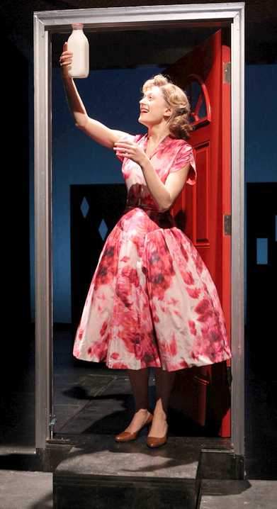 And take it on he does, pulling few punches as he examines the fact, fiction, and blurred areas between the two that constitute the "idyllic" life of the early Cold War era. The only problem with Harrison's treatment, and it's not a minor one, is that he's devised no concrete way of moving beyond the strict limitations of his otherwise fascinating and potentially hilarious premise. After establishing how at odds Katha (Marin Ireland), a book editor, is with the vagaries and complexities of life in 2011, and the desire of her Japanese-American plastic-surgeon husband Ryu (Peter Kim) to help set her back on the path to wellness, there's not much the playwright can do except let them stew in what Katha is positive she needs. That comes courtesy of Dean (Trent Dawson), the public liaison for the Society of Dynamic Obsolescence (or SDO), a Midwestern community that goes to extravagant lengths to replicate and preserve every aspect of life as it was in the United States in 1955. Upon meeting Dean, clad in a crisp gray suit and a fedora, Katha is immediately intrigued; Ryu is a harder sell, but eventually agrees. The two join the SDO for a six-month trial period, during which Katha learns to cook and clean, Ryu learns to construct boxes and deal with the institutional racism afforded Asian-Americans in the post-War years, and both see how Ryu's plant supervisor, Roger (Pedro Pascal), and Dean cope with... well, the love that back then dare not spoke its name. Harrison pursues a number of effervescent avenues for outlining the borders of the world-within-a-world, from glimpses of the no-nonsense, hard-sell orientation sessions with Dean and his wife, Ellen (Jeanine Serralles), to dinner parties loaded with hors d'oeuvres made by the enterprising Kathaor, in SDO speak, Kathy. But after the clever, tense setup, the follow-through is strangely sterile, even predictable. Kathy and Ryu become engrossed in their new old life, while Roger, Dean, and Ellen discover the jagged seams in their supposedly perfect existence. The arresting Act I finale, in which the bobbed-hair Kathy is born before your eyes with just a change of Ilona Somogyi's costumes, is as sparkling as the show gets. Deeper, more original insight into the impact the SDO might have on modern people, is not on the guest list. Ireland is marvelous as both the trodden-upon Katha and the freer-souled Kathy, transmitting an infectious joy as her character reconnects with the spirit she thought she'd lost; she plays everything for keeps, and doesn't slip into the parody that could come easily with this kind of transformation. Kim is a bit stiff throughout, and doesn't undergo the same emotional about-face that Ireland makes so convincing, but he effectively projects the wry skepticism so crucial for Ryu. Dawson and Serralles, wearing shiny, plastic smiles and shiny, immovable hair, are just right as the automaton-like guides to the SDO who are desperately in need of their own reprogramming. Pascal's agitator role is the most sketchily written, but he's fine as the embodiment of human chaos within a pocket of order. All the necessary elements are present, but what's missing is vividity. Director Anne Kauffman has staged the show decently enough, but doesn't draw enough distinctions between life inside and outside the SDO, leaving both halves of the action feeling uncomfortably the same. Alexander Dodge's set doesn't help: A curious blend of metal scaffolding and platforms that outline various rooms (and, at one point, even a full roof), it looks so modern that it essentially mocks the ostensibly more organic SDO scenes all by itself. And rendering the "real-world" largely in shades of grey and the SDO scenes in pinks and yellows is overplaying the hand: The question of what to think is never left to the audience. Harrison, however, doesn't leave much room for freedom of movement. He cycles through, breaks up, and reconfigures various clichés, but unleashes no surprises or insights that can't be found in that aforementioned proverb. This never tires, because the conflation of past and present is amusing no matter what, but it also never enlightens. You feel a shiver of dramatic danger only once, in the second act, when Roger spray-paints a devastating word across six identical-but-different doors depicting the tract-housing eternity in which he's trapped. That word, which won't be revealed here, is innocuous to us, but would justly be terrifying, even world-changing, to SDO dwellers. This bloody confrontation of reality with self-imposed fantasy demonstrates that Harrison is willing and able to take chances with his familiar conceit. What a shame that, for most of Maple and Vine, he chooses not to.