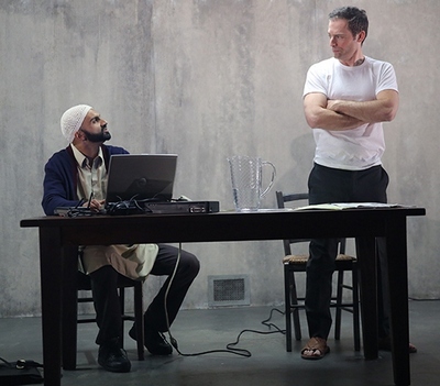 The setup is simple enough: An American banker, Nick Bright (Justin Kirk), is captured by militants under the command of the Imam Saleem (the quietly authoritative Dariush Kashani) and compelled to pay his own ransom$10 million worththrough his knowledge of finance. His closest thing to a sympathetic ear is Bashir (Usman Ally), the go-between who's tasked with making sure that Nick does what he's told and acting as Nick's hands and arms in lieu of giving him direct access to a computer. Over the weeks and months Nick must spend on this project, he and Bashir become closer both as friends and colleagues, with Bashir proving he's almost as capable as his captive of observing his surroundings and making split-second trading decisions based on what he sees. But if The Invisible Hand, the title of which derives from Adam Smith's metaphor for describing how individual choices silently affect economies, is the richest in plot of Akhtar's plays to date, it's also the most satisfying dramatically. Akhtar smartly weaves Nick's tiny concerns into a much broader philosophical discussion of the role the United States plays in global affairs, and whether that's a good thing or a bad thing. Nick is not ashamed to assert his beliefs that America constantly acts in everyone's best interests, a sentiment with which Bashir and the Imam do not readily agree, as they see primarily the devastation it's wrought on their own way of lifeexactly the quality they're struggling now to reverse. The argument is a compelling one from the outset, but becomes even more across the play's lightning-quick two-hour running time. Nick's actions ripple throughout both the local concerns of this small group of revolutionaries and the political stage as markets, fortunes, and even governments begin to rise and fall as a result. This, in turn, feeds still more unrest and puts Nick in the position of bankrolling doom for someone, though whether it's him, his captors, or even an entire country may not necessarily be determinable at any given point. But there are so many twisty developments that you, like the people you're watching, never stay in one place for long. (And don't worry: The complex underlying economic theories are all clearly explained, so you don't need to fear getting lost in that way.) There might, however, be a few too many threads tangling up matters. One of Nick's obsessions apparently exists only to provide a suspenseful first-act curtain, but its impact is utterly dissolved within seconds of returning from intermission. And not all the characters are well sketched: Nick doesn't make a sufficiently vivid case for American interventionism to suggest he really buys into his own words; a fourth onstage figure, Dar (Jameal Ali), one of the Imam's soldiers, is poorly developed and utilized; and though a few important people in Nick's life are name-checked (such as his wife and boss), no one much cares that he's missing for the better part of a year. All that seems to exist, then, are the world and moment of the play; believing anything other than them is a challenge. But Riccardo Hernandez's set, which depicts both a cave-like holding cell and a more opulent makeshift prison, is outstanding at defining the borders of the reality, and Tyler Micoleau has lit it with sharp, shocking effectiveness. Director Ken Rus Schmoll maintains that same atmosphere in his staging, a jagged and angry evocation of the powerful competing feelings at work. He's also done superb work with the actors, guiding Kirk to a masterful portrayal of resourcefulness in the face of shattered hopes and reality-cracked optimism; and Ally to find every shading in a man who's at once magnetic and enigmatic. You believe that both are victims of their circumstances, and that they need each other for the salvation that eludes them. Whether that salvation can ever be found in the dollars and rupees the two men are pushing is the open question of the evening. Akhtar's answer, as evidenced by Schmoll's final, haunting stage picture is inconclusive; it has to be, because of money's ability to buy good as easily as evil, and humanity's own frequent inability to tell the two apart. But what Akhtar makes obvious is that that power and influence must be respected, because to ignore it is to invite peril. Akhtar could make that point with a bit less fat and a bit more detail, but it's difficult to imagine many changes that could make The Invisible Hand more engrossing than it already is.
