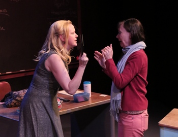 The entire play takes place in real time during the course of the meeting between the two. Gidion's mother, Corryn (Erin Cronican), has shown up at school for a previously scheduled appointment with her son's teacher, Heather (Susan Izatt). Ostensibly, she has come to find out why her son had been suspended from school just prior to his death a fight with another student, perhaps? But, of course, what she really is looking for is answers to the unanswerable, and to be able to uncover where it is she can lay blame and responsibility in order to assuage her own pain, anger, and sense of guilt. For her part, and quite understandably, Heather is taken aback. She hardly expected Gidion's mother to keep the appointment, and while she herself is not a young woman, she is a relatively new teacher and is unsure of how to handle the situation. But she tries as best she can to provide some context to Gidion's life at school, including his relationships with the other students. Throughout the evening, the two actresses, under Brandon Walker's direction, give nuanced and emotionally honest performances of complicated characters. Ms. Cronican offers up a Corryn who is a tough cookie, a single mom and a literature professor who tries to approach everything from a rational and analytic perspective as she sorts through Gidion's desk sifting for clues and demanding answers. She has little patience with canned responses and platitudes; when Heather tells her the students at the school are writing her sympathy cards, she tells the teacher to "collect them, then take them home and burn them." The most disturbing part of the play comes when, at Corryn's insistence, Heather reads aloud a piece of writing that Gidion had composed, the thing that led to his suspension. It is here that we come to understand why the company has chosen to pair in rotating rep Gidion's Knot with Martin McDonagh's dark comedy, The Pillowman, for the story that Gidion has written is as horrifically violent as anything that appears in McDonagh's play so much so that it does make us wonder why it is that Gidion was merely suspended and why the police and the psychiatric community were not brought into the picture. Regardless, it takes a lot of guts for Heather to read this aloud, and gradually Ms. Izatt shows us that beneath Heather's insecure demeanor, there beats the heart of a teacher anyone would be proud of, who authentically cares about her students, who listens to them and learns from them. In some ways, she knows more about Gidion than his mother does. And even though Corryn reacts defensively to Gidion's writing, we sense a shift in her perception. In the end, there is no catharsis, no moment of weepy bonding a brief one-sided hug tells us all we need to know about that but Corryn and Heather do understand one another a little better, even if neither of them will ever be able to untie the knot that was Gidion.