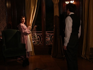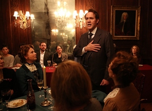 In Paul Muldoon and Jean Hanff Korelitz's adaptation of James Joyce's famous short story from Dubliners, Gaines and Burton are playing Gabriel and Gretta Conroy, who are attending the Epiphany party of the Morkan sisters in January of 1904, but are preoccupied with woes and history that no holiday merriment may dispel. You gaze as they put on a show of engagement before dinner, traipsing through small talk, musical performances, and the social niceties expected of gatherings such as this. But their resolve is clearly weakening, and they must endure its cracking through and after the meal until they retire for the evening, at which point there's nothing left for them to do but reveal the truth of their secret pain and confront itor notand deal with the aftermath. There's not a lot of story here per se, especially until the final scene in the bedroom, when the final barriers fall; much of the problem of this spin on the story is that, unlike Joyce, you're not able to probe the characters' inner minds and hearts. You're reliant, then, on deriving the story and, more important, the personalities from what's said and done, but little is, particularly from Gabriel and Gretta. The thinness of the plot is unavoidable in these circumstances, and, were you sitting in a traditional auditorium watching this unfold beneath a proscenium arch, there wouldn't be much fulfilling about it. The scenery is irresistibly authentic, yes (the "properties and interior design" are credited to Deirdre Brennan), and the costumes (Leon Dobkowski), lights (Michael Gottlieb), and sound (M. Florian Staab) are of the highest quality, but there simply isn't enough for even first-tier actors to fill with sufficient meaning to project beyond a row or two. But in a setting like this, you don't even need that much. When you're literally brushing elbows with the actors, able to look into and behind their eyes, everything you need to know is communicated when not even a word is said. Standing some five feet away from Burton, as the guests were filing out from the party around her, I was able to see the crippling exhaustion and emotional anguish in Gretta that would only be fully explained (or, if you will, exorcised) in the following scene. Without saying anything to me, or even looking at me directly, she made me complicit in her quiet deception. And when that last scene arrived and Gabriel attempted to comfort Gretta, I found that Gaines had me trapped just as much as Gabriel and his wife in a corrosive intimacy that could no longer be ignored.
