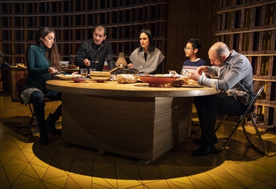 It's been given a loving production, beginning with Andrew Lieberman's set, which looks rather like the lobby of a hedge fund office. In fact, it's a living room in a present-day New York apartment, with elegant curved walls, ultra-shiny floors, finely wrought shelves, no carpet, and, as one character later observes, no sofa. Its inhabitants live well. And we never do learn how Noura, her husband Tareq (Nabil Elouahabi), and their adolescent son Yazen (Liam Campora) came by all that money. They're Iraqi immigrants, in the States for eight years after watching Mosul fall apart. Tareq has a good job on the staff of a prestigious local hospital, Noura was a gifted architect who dropped her trade to concentrate on mothering, and Yazen, in Campora's winning portrayal, is a normal kid, addicted to PlayStation. Prominent in their odd-looking abode is a gift-laden Christmas tree, and we get that Noura is ardent in transitioning to full-fledged American. We also get it because, in Raffo's often-monotone and sometimes-rushed delivery, she talks about it a lot. When you escape a broken country and enter an unfamiliar, utterly different culture, how much of your former self do you preserve, and how much do you abandon? Intriguing question, but we've a ton of plot to dispense before we get to it. Also on hand is Rafa'a (Matthew David), an old friend and perhaps more of Noura's, a successful obstetrician from a long line of them, who exists mainly to elicit insights from Noura that nobody else would. And there's the imminent arrival of Maryam (Dahlia Azama), a refugee the family's been sponsoring, who's now excelling in the sciences at Stanford. She enters, articulate, pregnant, and unapologetic. That throws Noura into a panic, and it turns out she has a Big Secret, one Raffo doesn't mask very well. "I don't want to forget," Noura says of her prior troubled life, but all the back-and-forth with Tareq and Rafa'a and Maryam about how much to remember or cast off comes off as ruminative, inconclusive. And like The Lifespan of a Fact, Noura has one of those endings-that-aren't-endings, a frozen moment in time where we're just about to learn something crucial and the playwright leaves us hanging. Still, there are some real issues raised, and some good speeches one about the search for a "safe space," another from Tareq about the woman he thought he wed and what their marriage turned into. (It seems very loving at first, but as we discover, these two have differing notions of "wifely role.") It's all punctuated by prerecorded internal monologues from Noura, and fairly frequent lines that are mentally indecipherable. "Saving is a sick negotiation." Wha? Joanna Settle directs with an accent on speed, which means much of the overlapping conversation in a rambunctious holiday-celebration scene is inaudible, and much of the dialogue give-and-take unnaturally fast, with responses before the character would actually be able to process his/her thought. Raffo's unvarying delivery aside, the actors are fine, and David and Elouahabi do quite a lot with the underwritten male roles. One suspects the similarity between the title character's name and that of Ibsen's famous heroine is no coincidence. Like Nora Helmer, Noura is struggling to play the role society has handed her, and while she has options, they're terrifying. But A Doll's House went somewhere. Noura, like many in the current cycle of new plays about theatrically underrepresented minorities, provides welcome disclosure into unfamiliar perspectives, but it's a long, static hour and a half. You might do better to visit Playwrights Horizons' Playwright's Perspectives page, where Raffo's author's note better articulates what she's trying to say about the struggle between individual and community, old and new self, American rugged individualism and narrow Middle Eastern traditions. Provocative topics, but in Noura, they come through only fitfully.