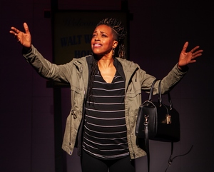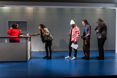 The performances, though, are top-notch. As Undine, Cherise Boothe is excellent. As an insufferably supercilious publicist, she is very amusing, and throughout there are moments in which she subtly reveals the character's vulnerability and insecurities. Boothe makes the character's reasons for (figuratively) killing off her family and old identity understandable, if not wholly forgivable, within the cultural and social context. The seven ensemble performers, who do quadruple duty (or more) playing Undine's family members and acquaintances, are all excellent. They transform themselves so completely it comes as a surprise to know afterward that the entire protean cast consists of eight total. All have their moments to shine, especially Nikiya Mathis as a caseworker from hell and Mayaa Boateng as an endearing and airy cyan-colored hair secretary. As an English professor whose cocaine addiction did not hurt his professional aspirations, Dashiell Eaves plumbs the monologue for droll humor. Heather Alicia Simms, J. Bernard Calloway, and Marcus Callender are equally fine playing a range of New York City sorts and members of Undine's kin. The design team ably presents New York City's grit, glamor, and matchless energy. Adam Rigg's sets effortlessly move the characters throughout the city, slyly transforming penthouse apartments into drug rehabilitation center community rooms in the blink of an eye. Montana Levi Blanco's costumes playfully capture New York's eclectic style, and Yi Zhao's lighting helps establish the City's dynamism. While it is easy to get caught up in the fast-paced, vibrant world of Fabulation, Nottage's play presents hard truths about issues of class, race, and gender. As the protagonist falls from social grace, she notes, "The crime isn't being a criminal, it's being broke. It's apparently against the law to be a poor black woman in New York City." It's a lesson Undine learns all too well.