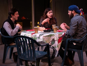 A production of the NOW Collective and directed by Padraic Lillis, The Wild Parrots of Campbell takes place at the suburban San Jose, California, home that Charlie (John DiMino) grew up in and recently inherited from his late mother. He lives there with two rent-paying friends, Nikki (Kasey Lee Huizinga) and Kevin (Adrian Burke), and his only-recently reconnected older brother Jack (a compelling Evan Hall). Though the youngest of the group, the 23-year-old Charlie has set himself up as the grownup head of the household. He is the only one holding down a steady job (as a Silicon Valley techie), provides the takeout meals and alcohol the others happily consume, and is lax about collecting money to cover expenses. Turns out that Charlie is not so much a soft touch as he is desperately lonely and looking for at least a semblance of a family structure to fill a deep void in his life. To this end, he has invited Amanda (Domenica Feraud) to come live with him. The two met as part of an online poker group, and they really don't know much about each other. For Charlie, having a live-in girlfriend is part of his overall effort to create that longed-for family. For 20-year-old Amanda, however, it is more a means of escape from an abusive home life; what she is looking for is a safe haven while she can figure out her next steps. Mr. Riad, the playwright, has done a particularly fine job of thinking through the transitional years between 20 and 30. Next in age to Charlie is 24-year-old Kevin, your stereotypical pot-smoking slacker/freeloader, friendly but oblivious. Nikki, at 27, the lead performer in a self-described “queer punk band” at a local bar, is the longest-entrenched member of the group. Sarcastic and defensive, she is fearful that Amanda's presence will lead to her and Kevin being sent packing with nowhere to go. And then there is Jack, the 31-year-old keeper of memories of growing up with his and Charlie's destructive wreck of a mother. Charlie has more or less blotted out what Jack recalls vividly, and the play is as much about Jack as it is about Charlie, who is just glad to have his brother back in his life after an absence of more than a decade. There is a hint of Sam Shepard's True West that manifests in the self-destructive behavior of Jack and in his relationship with Charlie, but Riad is focused more on the individual and collective struggles of his characters, who are caught like flies in flypaper during a challenging time in their lives. They will either break free or become trapped in a permanent state of malaise and purposelessness. The exposition-heavy first act runs long, and I would love to see more development of the characters of Nikki and Kevin, but overall this is an original and thoughtful take on a group of lost and floundering souls whose futures remain uncertain and unpredictable even by the end.