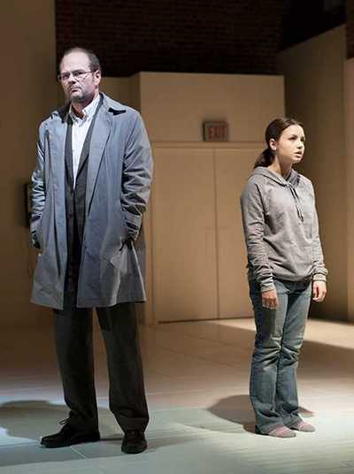 The underlying ideas here are not new for Gibson, who in previous works like [sic], The Suitcase, and This has charted similar territory across the span of adulthood from post-college to solid middle age. Both she and her frequent collaborator, director Daniel Aukin (who helms here as well), operate in a sharp, poetic, staccato style that captures the unfinished sentences and half-formed thoughts that make up so many interactions, while also demonstrating that these false turns can mask deeper and more uncomfortable truths we'd prefer to keep hidden. And for this play, centering on a between-jobs middle-aged economist named Hank (played by Chris Bauer), who's unable to resume his life even after a lengthy separation, that approach would seem to be ideal. In no small measure it is, especially as we first meet the people who surround Hank. Foremost among them is his 16-year-old daughter, Marlene (Aimee Carrero), who lives with his estranged wife and has been so programmed that she won't even open the door for dad. They spend their initial exchange together staring vaguely at each other through its (unseen) obstruction, and speaking with just as much misdirection about the shared feelings and experiences that no longer mesh. When, later on, Hank visits the hospital at which Marlene volunteers, she's literally unable to look at him, forever staring morosely (usually at us) as he attempts to engage her eyes and her brain more directly. Hank is as dysfunctional in other areas. After more than two decades of marriage, Hank is socially awkward around others, which he proves in trying to woo and bed Lydia (Seana Kofoed), a woman he met at the hospital whose own romantic and sexual history is distinctly underdeveloped for someone in her 40s. His strongest relationship, in fact, is actually with Sheryl (Da'Vine Joy Randolph, recently of the musical Ghost), a struggling actor he meets while working as a supernumerary at the opera house: She can't help but look at him and analyze his psychological choices during crowd scenes, and is more than willing to give him the kissing practice he needs, even if it comes tied to the internal inadequacies that drive her every bit as much as his own do him. While Gibson focuses on these aspects, What Rhymes with America maintains its consistent level of engagement. Bauer is an engrossing presence to have at its center, sturdy of manner and voice yet inescapably vulnerable beneath them: You believe that this is a man who could get into a shouting match with his wife over the phone when he's just seconds away from sex with his new fling. Carrero has no trouble projecting the angst and confliction of adolescence as Marlene and suggests a vivid personality beneath the parched skin, just looking for the opportunity to break free. There's a delightful sense of damage and misplaced affection inherent in Kofoed's portrayal, underscoring Lydia's sadness and desperation; and Randolph tackles Sheryl with gusto, if rarely quite the detail needed to make more like a person than a dramatic catalyst. The specific brand of quirkiness that has traditionally characterized Gibson and Aukin's work, however, does not always find a natural home here. These are all beaten-down people who are struggling to reawaken to what life has to offer, and they're too infrequently given the room they need to evolve on their own terms. This problem is partially embodied in Laura Jellinek's set, which in primarily depicting the hospital (with most of the other scenes established by Matt Frey's lights) pushes the theme of unhealthiness a bit too far. And Aukin's staging, though minimalistically inventive, often calls as much attention to itself as it does the writing. (The 20-foot cord attached to "the last payphone in New York City" elicits far too many laughs at just the wrong time, for example.) Of course, they're limited by Gibson's contributions, which are scattered whenever they're not sobering. The scenes following Hank and Lydia's aborted assignation, in which she tries to reclaim the bra she left behind, make too explicit the undercurrents of obsessiveness that are more interesting when they're subtle. Much the same is true of Marlene's recurring strumming of a guitar and singing songs of woe, not just punctuating but overwhelming many scenes, and pushing us away from these people rather than bringing us closer to them. And Sheryl's endless late-show litany of the myriad figures she's obsessed over while watching The Ring Cycle may be a manifestation of her wayward mind, but it plays as an intellectual exercise in comedy that, at least at the performance I attended, you could feel suck the air out of the audience. Excesses like these obscure what is, at its core, a simple and lovely tale of emotionally lost people rediscovering life, with all the complexities, hope, and heartbreak it entails. Their journey is hinted at in the title itself: a non-question question that is addressed, however incongruously, by evening's end in exactly the way you expect. If the nuances could be less clouded by silliness, there's an inescapable power to the play's contention that sometimes nothing really can be everything.