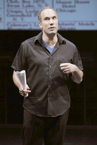 That idea, not to put too fine a point on it, is racism. Not unusual for a play in New York, you say? At The Public, no less? No, probably not. But Smith peers at the racial divide that exists between the two most politically prominent non-white ethnic groups of the last half-century: African- and Latino-Americans. And he does it through the appropriate lens of the American Pastime, specifically regarding a game on August 22, 1965, when "Dominican Dandy" Juan Marichal of the San Francisco Giants introduced Los Angeles Dodgers catcher Johnny Roseboro's forehead to the business end of a baseball bat. The ensuing enmity, which would span decades, is a crystalline statement about the rocky nature of United States race relations, and one that's neither condescending nor overrepresented. Smith's notions of using this encounter to examine the evolution of tolerance and threading his then-perspective of the incident as a young, light-skinned black boy - and intense Johnny Roseboro fan - into a broader cultural critique are incredibly smart. It's the kind of satisfying theatrical Connect-the-Dots that the better solo artists, including Daisey at his most astute, play with a well-deserved relish. Smith, alas, never gets that far. Unlike Daisey, who always works from notes but never seems to need them, Smith has chosen to work without a safety net and behaves like his trapeze just snapped in mid-arc. His audience-interaction segments, many inquiring if onlookers know certain locations in his native Los Angeles, are bafflingly disconnected affairs. His speech is constantly halting, as though he's always searching for the best word to use and failing to find it, and delivered toward random corners of the theater rather to the audience. And, at least at the performance I attended, Smith both visibly lost his place more than once, and was almost always on the verge of running out of breath entirely. Because Smith evinces no confidence about his own presence, he does little to instill in you any particular faith or involvement in the events he relates. More serious still is that he's organized the play in so scattered and overwritten a way that that potentially dynamite premise can barely be located in the first place. A 10-minute montage in which Smith recounts Marichal's and Roseboro's lives in their own (unimaginatively recreated) voices could probably be accomplished in a handful of third-person sentences. Yet another outing, when Smith plays Roseboro (metaphorically) recanting on his (literal) deathbed, drags almost as much in making a point that's restated much more effectively a scene later anyway. Smith's attempts to inject to draw generations-spanning parallels by describing his troubled dealings with his daughter fall flat because they have no direct connection to his central thesis. And are the interpretive dance interludes between scenes absolutely necessary? Marc Anthony Thompson's video projections support Smith's underlying narrative about the play's title characters' roles in the dialogue about national discrimination, as well as his own (distant) part of that conversation. But almost all the writing and production's other trappings feel like traps, restricting rather than setting free a resolutely American tale that's worth telling but has rarely (if ever) been dramatized. If Smith can refashion what's here into a single, clear, and personal narrative, without all the decorative fat, this attractive mess could be a stunning solo tour de force. That goal is not necessarily out of Smith's grasp. As part of the Public LAB developmental series, the show is likely still in flux. (This may also explain Smith's difficulty wrangling it, even if it's not an excuse; other Public LAB shows, such as this past Spring's Bloody Bloody Andrew Jackson, have looked transfer-ready from the get-go.) It's unlikely that Smith will ever be Daisey - but that's a good thing: Smith's outlook and point of view are distinctive and original, and deserve to be heard. Right now, however, Juan and John's excess is making them far too hard to hear.