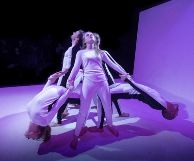 Well-read audience members might recognize excerpts from any of the 10 authors whose published works provide the text. Among these are Charles Bukowski, writing about a father-son relationship ("he hinted at times that I was a bastard and I told him to listen to Brahms"), and Grace Paley, who, in one of her short stories, speaks of a writer whose father presses her to create more plot-driven tales, like those of Maupassant or Chekhov. A plot-driven tale, the hour-long All That Dies And Rises, at the IATA Theater, is not. Rather, it is a performance piece that combines the textual excerpts with choral singing (music by David Skeist), background sounds designed by Michael Costagliola and Alexander Clifford, and the sometimes playful but often tension-filled and very physical choreography of Laura Butler Rivera, all performed within the white box stage area by a cast dressed in Olga Mill's simple two-piece costumes (black on one side, white on the other). In addition to evoking an overall feeling of tension among the players, All That Dies And Rises incorporates an intriguing element of metatheater by calling attention to itself by quoting from Gertrude Stein ("your emotional time as an audience is not the same as the emotional time of the play"), andin one particularly effective sceneby turning the telling of the Grace Paley story into a cozy reading, as members of the cast hurriedly set up a living room, complete with chair and footstool, rug, lamp, a book, and a group of listeners hunkered on the floor around the reader. It is interesting to note that the director worked as assistant to Peter Brook on his production of The Valley of Astonishment, both in Paris and more recently with the Theatre for a New Audience at the Polonsky Shakespeare Center. Mr. Brook's influence can clearly be seen, but Mr. Rutherford is moving even more deeply into the abstract to get at the essence of meaning. Even when that meaning is sometimes elusive, this is excitingly original experimental work he is engaged in, and it is fascinating to watch as it unfolds. It may be because of the level of imaginative creativity that has gone into developing this piece that he has been able to attract such a strong cast of seven highly talented performers: Christopher Cancel-Pomales, Camber Donahoe, Jon Froehlich, Rachel Kodweis, Maury Miller, Casey Robinson, and Emily Viancourt.