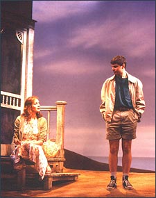 Kate Jennings Grant plays Dorothy, the older woman who, while her husband is off at war, teaches Hermie much about life and love. Grant has a strong maternal and sexual flair, and real chemistry with Driscoll; their scenes together have real poignancy and warmth. When the two of them are alone on the beach at the end of the first act and singing the emotional "Someone to Dance With Me," it's a powerful, meaningful moment. This is due, in no small part, to the work Kirshenbaum and Foster have done in their adaptation. They have created a fully integrated work, where dialogue and songs interweave seamlessly, complementing each other with great precision. While both are very good, Kirshenbaum's score is a little better, very attractive and with a sound unlike other recent musicals. Kirshenbaum has written particularly well for the demands of the characters and the strength of the cast; Hermie and his friends (Brett Tabisel and Jason Marcus, both giving strong comic performances as Oscy and Benjie) are musicalized with close harmony, while their young romantic interests (Celia Keenan-Bolger, Megan Valerie Walker, and Erin Webley) take it a step further, becoming a singing trio not unlike the Andrews Sisters, with the requisite moves and panache. Greg Stone and Bill Kux, as Dorothy's husband and the local drug store owner have less onstage time, but are hardly short-shrifted as characters musically or dramatically. Barre's direction and choreography are the icing on the cake, pointing up the best moments and making them better still. His droll comic take on Hermie's adventurous trip to a drugstore in the second act, or an uncomfortable date at the movies in the first, are laugh-out-loud funny, while he proves just as capable later of tugging at the heart strings and getting to the heart of what growing up really means. Watching the events of Hermie, Oscy, and Benjie's fateful summer unfold makes it difficult to not cast a similar gaze inward. Hermie's awkwardness and confusion, rife at the show's beginning, belonged to all of us once; his moments at the end of the show, exemplified primarily by a simple embrace and dance prove to him that he is becoming an adult, much the way events in our own lives may have as well. But these moments of realization come later. When the adult Hermie, at the evening's beginning, stands downstage looking up at the beach where his life changed, listening to each of the characters tell him it was "a summer you'll always remember," at that point, you don't quite understand. When the final, beautiful moments of the show arrive, you will, but until then, this is definitely a Summer you'll never want to end.