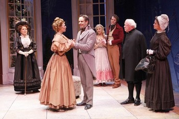 Still, if only more musicals had even this much! Wilde's crackling comedy, about two London men whose tendency for adopting new personalities in the country causes major problems when both hit the same house at the same time, is as lively and riotous as ever. Jack (here, Noah Racey) and Algernon (Ian Holcomb) are two fizzingly funny creations, and the antics their alter-egos, respectively Ernest and, uh, Ernest (Algy adopts Jack's alias as his own), inflict on Jack's ward, Cecily (Katie Fabel), and fiancée, Gwendolen (Annika Boras), simply could not be improved upon. This, of course, is what causes the infelicities that pockmark Ernest in Love. The score, which pays more than glancing tribute to Gilbert-and-Sullivan operetta and Alan Jay Lerner-style patter, is simply not up to the book. Croswell has done little more than cut down Wilde's script, albeit with incredible deftness that dilutes none of the pungent wit or precise plotting, standing in stark tribute to (for example) Lee Hall's reduction of his own film Billy Elliot or Steven Sater's simplified take on Frank Wedekind for Spring Awakening. But every time a song starts, the sparkling temporarily screeches to a halt. Except for "Lost," a lovely if somewhat incongruous second-act duet for Algy and Cecily, the musical numbers inflate faint mentions from Wilde without expanding or enlightening. Jack fretting about proposing to Gwendolen in the spoke-sung "How Do You Find the Words?", Cecily dreaming of "A Wicked Man," or her governess Miss Prism (Kristin Griffith) and the rector Dr. Chasuble (Peter Maloney) dueling with the saucily taunting "Metaphorically Speaking" are simply extraneous moments. Gwendolen and Cecily's "My Very First Impression," in which tuneful sororal admiration becomes cat-fight hate within seconds, and the small-talk laden "The Muffin Song" come closer to the mark. But most of the time you find yourself hoping the songs will end so the ripe repartee can begin again. Never a good sign for any musical. It must be noted, however, that Moore has directed and staged (on James Morgan's feather-light and spring-bright set, and with Linda Fisher's elegant costumes and Brian Nason's fine lighting) with unerring vivacity and energy, as if she were committed to presenting a top-tier production of Wilde's play. Her unwillingness to depend on songs that can't help her - despite the virtues of musical director Mark Hartman's energetic four-piece band (which includes a harp) and Barry McNabb's unassuming choreography - aids the evening tremendously. As do most of the cast members. Holcomb is a real discovery, giddily embodying Algy's gadabout nature, but always balancing his barely contained playfulness with the mock stuffiness he affects for others' benefits. (Despite the paucity of musicals in his program bio, Holcomb also sings exceedingly well.) With the exception of Racey, who's charming in a soft-shoe break in his opening number but otherwise almost constantly mugs through his scenes and songs, the other performers are appropriate and talented enough to play Wilde's version and arouse no suspicion and encourage no refunds. This especially includes Beth Fowler. A winning actress whose roles are usually more of the softly maternal variety (she's best known to current audiences for originating Peter Allen's mother in The Boy From Oz and Mrs. Potts in Beauty and the Beast, both on Broadway), she steps into Gwendolen's mother's caustic shoes with absolute authority. She pierces with every zinger, fills the theater with her bulging-eye and puffed-cheek looks, and radiates exactly the sense of frozen societal judgmentalism the character needs to thrive. Fowler is an utter joy in the role. She also knows just what to do with a song that would stymie many lesser actors. "A Handbag Is Not a Proper Mother" merely stretches out of a few lines of Wilde that explain Jack's twisted provenance, yet Fowler wields it like a razor-tipped anthem that intricately details her own previously inexpressible life philosophy. For the few brief minutes she glowers and powers through the song, you stop thinking about everything the music isn't giving you that the book is. Yes, you return to drudging reality not long after. But whenever Fowler, Croswell, and Moore most firmly embrace Wilde, Ernest in Love delights too much to seem as unnecessary as it actually is.