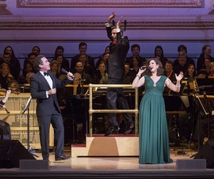 With the help of the Essential Voices USA choir (under the direction of Judith Clurman), Reineke and the Pops were able to make a big impact all on their own with their spins on some familiar tunes. The cleverest and most unexpected was "Little Bolero Boy," Katherine K. Davis's twist on the somber "Little Drummer Boy" mated withyou guessed itthe underlying excitement of an arrangement akin to Ravel's Boléro. They paid tribute to "A Charlie Brown Christmas," now 50 years old, with a haunting, wintry rendition of Vince Guaraldi and Lee Mendelson's "Christmas Time Is Here," and an up-tempo traipse through a revamped "Angels We Have Heard on High" (arranged by David Chase). John Williams, once again hot because of his Star Wars: The Force Awakens soundtrack, was represented, too, with the surprisingly majestic "Merry Christmas, Merry Christmas" from, of all things, Home Alone 2. And one of the Pops's signature bits, a hard-driving, electric-backed version of "Jingle Bell Rock" was just as wry and winning as ever. The guests artists this year were musical theatre stalwarts Brian d'Arcy James (taking a break from starring in Something Rotten!) and Stephanie J. Block, and they proved an apt and cozily contrasting pair for leading our sleigh ride through classics both new and old. One of James's shining moments was a song he wrote himself about his home state, titled "Michigan Christmas," which pointed up the key differences between the hustle-bustle of big-city life and the simpler pleasures of the Midwest; a smile infused every word and lyric, easily conveying just how much his childhood home still means to him. And Block gave a heartfelt rendering of Wesley Whatley and Bill Schermerhorn's "Yes, Virginia," a musical adaptation of the favorite child's Christmas letter, made even more poignant by her pre-song speech about this being the first holiday she and her husband, actor Sebastian Arcelus, are parents themselves. Block was the most natural and likable I've ever seen her when tackling new standards like "It's the Most Wonderful Time of the Year," "Winter Wonderland," and "I'll Be Home for Christmas," her sometimes too-broad Broadway brashness generally well managed. James brought a touching sincerity to "The Christmas Song" and "Silver Bells," too, and both ended the first half of the program on a wave of excitement with Reineke's own "Holiday Hits Medley," which found him bopping out to "Feliz Navidad" and Block going after Mariah Carey (quite convincingly) with "All I Want for Christmas Is You." James and Block joined forces for contributions from Jule Styne and Sammy Cahn in "Let it Snow! Let it Snow! Let it Snow and Frank Loesser with "Baby, It's Cold Outside," arranged by Fred Barton as an atypically evenly matched battle of sexual wits. The evening came to its conclusion first with Block singing, pointedly and powerfully, what she claimed was her favorite carol, "O Holy Night," backed by the choir and its loudest and most fervent, and then with the charming traditional finale for these Pops celebrations: a Christmas sing-along, where you get to join your voice with the pros to salute the season in style. There's nothing quite like hearing a few thousand people unite in the likes of "Hark, the Herald Angels Sing," "Silent Night," or "Joy to the World," but Reineke and the Pops do everything they can to ensure that the rest of the concert is the next best thing. They had no trouble this year, and James and Block were only further garland on the tree. Whatever your view of the holidays, it was represented in high style and even higher spirits that are already making Christmas 2016 look sadly far away.