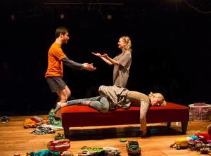 Danny (Ben Mehl), a stay-at-home dad, and Kris (Suzy Jane Hunt), a stay-at-home mom, meet cute in a Brooklyn park, where each of them is pushing a baby stroller and trying to keep tabs on their respective three-year-olds at the same time. When we first encounter them, they are both in such a state of sleep-deprived lunacy, you are convinced you are seeing a romantic comedy that will surely end with the two of them married or living together and raising all four children under one roof. But the playwright does not lead us down that familiar pathway after all. Instead, he upends our expectations as we learn more about the beleaguered pair and their respective spouses, Danny's wife Donna (Rachel Mewbron), a gifted mathematician with a blossoming career, and Kris's wife Veronica (Liz Wisan), who is struggling to make ends meet at her family's pizza restaurant, a long-standing money pit of a business that is suffering under the blows of their Brooklyn neighborhood's gentrification. Both marriages have established a division of labor, wherein Donna and Veronica work outside of the home, while Danny and Kris do the child rearing. It seemed to be a reasonable and economically sound way of handling things, but raising children on a fulltime basis turns out to be difficult. The two caregivers develop a simpatico relationship out of their mutual sense of drowning in the perpetual demands on their lives. (The "drowning" analogy is apt, as Justin Propper's sound design incorporates lots of rain, and even a leaky roof). But even if misery loves company, it turns out that Danny and Kris are each floundering in different ways. Kris has suffered a crisis of the soul that has caused her to abandon her former career as a nurse. Staying at home with the children helps to compensate, but the loss of her income is creating a deepening rift between her and Veronica. For his part, Danny spent many fruitless years trying to establish a career as a musician, until he and Donna settled on their current routine. Danny understands he has no right to be resentful, and he tries to be supportive of his wife's increasing responsibilities at work. But it has become too much for him to bear. More than anything, what is damaging to both marriages is a failure to communicate openly. Everyone wants to be seen as competent and is unable to admit to needing help. A plot twist that involves an injury to one of the kids brings the couples together, and their discussions result in a measure of improvement in their lives. But all four parents and their marriages will need nurturing, and it will take time and hard work to rebuild their relationships. DANNYKRISDONNAVERONICA is an ambitious play that, after it establishes its premise and conflict, does not offer easy solutions. Relationships are complicated, and while, by the end, Kris seems to be on a more solid footing, Danny remains lost, unsure if he has any identity outside of parenting, and whether that is enough to sustain him. All four cast members, under Jeff Wise's direction, do an excellent job of bringing out the complex nature of their characters. Ben Mehl is especially strong as Danny, combining elements of goofy humor, passive-aggressive behavior, and a struggle to figure out his place in the world. Lawrence Dial, the playwright, has had a number of well-received productions of his plays in the past several years, and he definitely is a writer to follow.