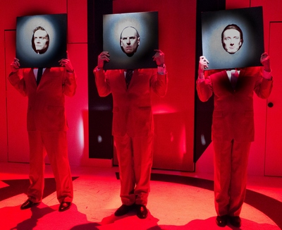 The former is a catchphrase from Rowan & Martin's Laugh-In, a popular TV comedy show from the early 1970s noted for its format of quick blackout sketches, with performers popping up through multiple doorways and windows, recurring characters, and old style baggy pants burlesque jokes told with a snappy delivery. The latter is associated with the BBC's Monty Python's Flying Circus from the same time period, a show that offered up comic sketches of elaborately crafted absurdity, featuring non-sequiturs delivered with straight-faced seriousness. Sublimely ridiculous,Everybody Gets Cake! draws inspiration from both of these, as well as sources as varied as the silent film era's Keystone Cops and Peter Schickele's musical parodies credited to the fictional P.D.Q. Bach. You don't need to be acquainted with the show's comic touchstones in order to enjoy the zaniness. But if you are, you will appreciate how Everybody Gets Cake!brainchild of the creative team of Joel Jeske, Danny Gardner, and Brent McBethpays homage, while adding wonderfully inventive original material. My personal favorites were the Monty Python-like segments involving the use of a training manual called "Awkward Human Contact;" a silent bit about a World War I flying ace; and a musical work performed on iPhones. Everybody Gets Cake! runs nonstop for 75 minutes, with its versatile creators taking on 44 different roles (Ryan Kasprzak takes over for Mr. Gardner starting tomorrow). Ben Model, who has carved out a distinguished career for himself performing live piano and organ scores for silent films, does a beautiful job accompanying the merriment. Mark Lonergan skillfully directs the trio so that they seem to be like pinballs whizzing across, around, and through Maruti Evans's eye-catching set. All told, the resulting mayhem makes for a perfect pick-me-up on a cold winter's eve.