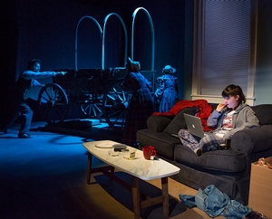 Bekah Brunstetter's new play for Fault Line Theatre at the WP Theatre pays clear and loving homage to the game it's titled after, its first action being to transport us back to the sepia-tinted year of 1997, when a plain and downbeat 12-year-old girl named Jane (Liba Vaynberg) plays it in the computer lab while waiting for her mom to pick her up from school. And, as we all did once upon a time, she envisions herself and those she knows, including her older and more "together" sister Mary Anne (Laura Ramadei) and Billy (Juan Arturo), the cute boy she has a not-so-secret crush on, traversing the trails, fording the rivers, and discovering exciting surprises as she explores the uncharted territory on the opposite side of the Missouri River. Sadly, what comes next is rather less romantic. Jane pads through the rest of school, completes a useless major at college, and finds herself marooned in her mid-20s, her mood still muffled and with no boyfriend or career prospects, so that there's not much to do but seek refuge with her sister while she figures out what should come next. And because the path of life is rarely as linear or as well marked as that from Independence to Willamette, she ends up occupying that territory far longer than she intendsor that her already-fractured relationship with Mary Anne can stand. At least now that a certain beloved game from her youth is now online, she can fill her daysalthough the narrator seems to be describing a wholly different, if more realistic, trek than once he did. ("What would you like to do? You may: 1. Continue on the trail. 2. Stop and rest. 3. Watch Extreme Makeover Home Edition, the one where half the familys in wheelchairs so they build lots of ramps and you cry.") Brunstetter fills most of the 90-minute running time by juxtaposing the two very different voyages of our Jane and the one from 170 years ago (Emily Louise Perkins), who is traversing the country with her own version of Mary Ann and her enterprising widower father (Jimmy King), which unfold on the two opposing ends of the stage. (The set, split between realistic-modern and wagon-train kitsch, is by Tristan Jeffers.) Her goal seems to be to underscore how concepts of survival shift across the generations, and how our evolving needs create new woes that are no less difficult to overcome than older ones, even if they're objectively less life-threatening. But present-day Jane is not exactly just a thin-skinned snowflake. There are clues that she is, in fact, afflicted with clinical depression, and that her actions are not entirely within her own control. If that's true, Brunstetter's analogy breaks down: Depression is no less a disease than typhoid fever, even if its symptoms are considerably different, and the obstacles Jane faces both internally and externally are deserving of more serious treatment than the playwright gives them. If Jane is not suffering from a genuine medical condition, the suggestion otherwise muddies the waters too much for the rest of the play to make sense; when the two Janes meet, which of course they must, it's not a satisfying explanation for the bond they so obviously share. There's much that's good about The Oregon Trail. Geordie Broadwater's staging is incisive, funny, and quick-moving. The physical production, which also includes period-clashing costumes by Izzy Fields, sprightly lights by John Eckert, and clever sound by Chad Raines, is spot-on for both eras. And with the exception of Arturo, who lays on Billy's adolescent charm a bit too thick, the acting is well pitched with the writing. Particularly good is Ramadei, who accomplishes the difficult task of making both Mary Annes feel as though they've been carved from the same chunk of contemporaneity, but Vaynberg and Perkins limn no shortage of sincerity or psychological reality from two women who are each tasked with blazing different kinds of trails. And Craig Wesley Divino, as the ever-nagging voice of the game, is a deadpan hoot. Still, Brunstetter's writing and conceptualization could be sharper, and, as witty as the references to it are, the game is more of a diversionary tactic than a fully integrated storytelling mechanism. Too often, particularly in the second half, the implication is that Jane's choices don't matter, and she's careening toward certain disaster regardless of which option she picks. That is sometimes true of life, especially as we get older and fall into ruts and routines that make diverging from the well-traveled road a challenge if not an impossibility. But for Brunstetter's heroine, the meaning of that helplessnessand thus the play that's based on itis earth-shakingly different depending on what her malady actually is. As it is, we're not sure Brunstetter even knowsand that's a problem the show never overcomes. Neither Jane knows where her journey is taking her, but must press on anywayand that attitude, though proper for pioneers, is one playwrights are better off avoiding like dysentery.