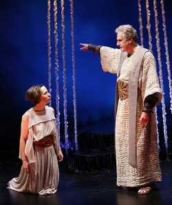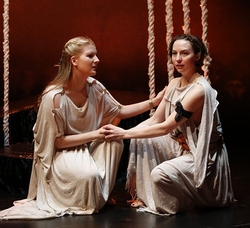 Beyond this, however, is Heaney and Moore's joint muting of the two critical grander contexts against which this battle of wills unfolds. The first is that of the gods, who are uncharacteristically uninvolved and uninterested this time around. Perhaps worse is the deletion of the chorus. Oh, their lines are still present, but Moore has reassigned them to the various actors to deliver in character, as though there's no difference between, say, Antigone's fiancé Haemon or mother Eurydice and the group of Theban elders Sophocles (and, well, Heaney) outlined. Combine these changes with stiff, cramped staging on a Tony Walton set that looks, for some unfathomable reason, like the deck of a ship, Linda Fisher's thoroughly generic "back then" costumes, and Brian Nason's Pirates of the Caribbean lighting, and the universe becomes one in which everyone operates without having to answer to, or for that matter merely be cognizant of, anyone—celestial or terrestrial—who may be watching or judging them. This changes a sweeping, riveting tale of societal, religious, and personal obligation into a flavorless depiction of a petty family squabble, bereft of heat, history, or point. The lack of any underlying structure so restricts the actors that it seems as though most of them are merely off-book and haven't begun exploring their characters as people. Rebekah Brockman's entitled, student-myopic take on Antigone and Paul O'Brien's stiltingly professorial Creon suggests that they and their chemistry would be better suited for a summer stock run of David Mamet's Oleanna. Winsome Brown is a hollowed-out, almost dazed Eurydice that projects the mien of a first-time supernumerary at the Met. As the blind seer Tieresias, Robert Langdon Lloyd conveys vocal strength but no supernatural authority; Rod Borgan and Colin Lane, respectively the Messenger and the Guard, give small, showy performances that don't mesh with their stolid, functionary characters. Ciarán Bowling is far too lightweight to be completely right for Haemon, but he hints at a potential, if untapped, strength, that with time could be developed into the necessary complexities. Only Katie Fabel, who plays Antigone's sister Ismene, is an unqualified success. Her entire manner, from her posture to her voice to even the drop of her hair, is that of a young woman torn between extremes: striving to maintain her blood-innate regality while longing to do the right thing by her deities and her lineage alike. When Fabel's Ismene pleads before Creon to assume some of Antigone's responsibility to keep them on equal footing, the show finds tension and genuine emotion for the first—and only—time all evening. Fabel does what no one else has been able to do with The Burial at Thebes, and bridges the gap between personal conviction and outside expectation, and lets us see the agonized heartbreak we can incur when an imbalance forms between them. It's a sumptuous scene linking to Antigone at its best, and reminding you of the power that you're denied experiencing at every other step along this awkward, anesthetized rethinking.