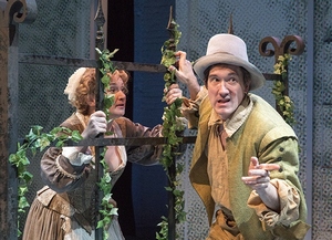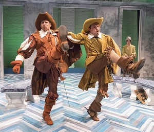 The staging from Michael Kahn, artistic director of the Shakespeare Theatre Company in Washington, D.C. (where this play premiered in 2010), is grounded yet zippy, so you're always believably coexisting in both the real and the ridiculous. Murell Horton has provided an eye-grabbing collection of period costumes as passed through a Technicolor filter, Mary Louise Geiger's lights flood the playing space with the proper jolts of excitement, and the original music (from Adam Wernick) adroitly captures the proceedings' innate jauntiness. Only Alexander Dodge's sets, which project a dullish, low-budget vibe without embracing a firm point of view (why do the paintings look like an unpaid intern Photoshopped Roy Lichtenstein?), seem at odds with the rest of the production. Christian Conn is a devilishly good Dorante, locating every possible drop of sincerity within a man who could not begin to understand the meaning of the word. Tony Roach brings a billowing swath of wry bravado to Clarice's fiancé, Alcippe. (Both actors created their roles, and their bone-deep familiarity with them is thrillingly evident throughout.) Ismenia Mendes and Amelia Pedlow craft Clarice and Lucrece with lush, bold strokes and understated gaiety that let them shine even though they're a bit removed from ground zero of the silliness. Kelly Hutchinson, Aubrey Deeker, and Adam Lefevre bring robust commitment to their smaller roles, rounding out the company's periphery with attractive and intricate detail. Perhaps no one onstage represents The Liar better than Carson Elrod, who, as Cliton, embodies the concept's playfulness with an unabashed love for the unusual. From his opening speech ("Ladies and gentlemen! Mesdames, messieurs! / All cell phones off? All cellophane secure? / Please note, for an emergency, the exit. / We're set! We've stowed our snacks, we've peed, we've sexted."ick, there's another one of those non-rhymes) to the lying lesson with Dorante that supercharges the start of Act II, he's as masterful at ejecting jokes from his voice as from his constantly moving, clay-like limbs. In other words, he succeeds for the same reason Ives does: because he takes his comedy seriously. That's why it doesn't matter if The Liar is intellectually or socially redeeming. Ives so wants it to be the best badness it can be, you'll never for a second feel like you're being shortchanged.