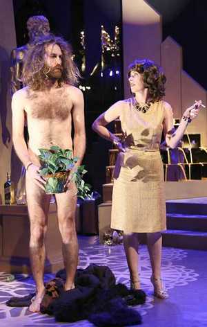 Once the opulence begins to transform Wildman, however, clothing his (literal) nakedness, convincing him that drinking out of a crystal goblet is superior to sipping from a plain cup, and pouring him into the bed of a glittering socialite (Lana Lesley) concealing plenty of ulterior motives of her own, any claims to originality are abandoned. Is there any question whether he'll forget his older, worse self and the pro-environmentalism cause that propelled him to compete in the first place, or whether the ruling body will even let his complaint be heard should he be found qualified to make it? Of course not. Rude Mechs prides itself on its experimental bent, and certainly vestiges of a unique production process are on display throughout. The tap-danced interludes that symbolize the unbridled yet mechanical joy that is all these people know. Scenes, spoken directly to us, in which the actors appear to reflect on their own dysfunctional real-world relationships with money and the fruits it enables. And a powerful fixation on queso, which shows up on chips, in a fountain, and slathered over most performers' bodies before the evening is through. One doesn't see how all this couldn't add up to something. But it doesn't. The final product is a rigidly conventional and uncomfortably familiar one that stops short of seriously challenging any taboos. Despite being inspired in part by the writings of Ayn Rand (per a program note), it doesn't really address questions of self-reliance or even the capitalist ideal; its underlying messages seems to be no more complex than "money corrupts, and absolute money corrupts absolutely"Bertolt Brecht without the pretense of nuance. (The metal magnate played to smarmy perfection by E. Jason Liebrecht is unsurprisingly named "Steele," for example.) A stage version of Rand's individualist ode Anthem, imported to New York by Austin Shakespeare earlier this season (Rude Mechs is based in the same Texas city), proved more subversive because it didn't shy away from Rand's core issues. Stop Hitting Yourself is at least entertaining, though, and that counts for a lot here; its pungent sense of humor and impeccable style making its scratched-record themes into easy-listening tunes. The elevated acting style does not clash with the appropriately overstuffed scenery, and lets takes as diverse as Graves's anesthetized Wildman, Paul Soileau's dotty but manipulating queen, and Heather Hanna's naturalistically put-upon maid easily coexist. Hanna and Soileau, in fact, are at the center of the show's most interesting narrative segment: when the queen convinces her servant to pay her for the "privilege" of chugging the unknown liquid within. The queen's tactics are deplorable, sure, but the maid's willingness to play a game she's well aware could lead to her destruction proves all too effortlessly why the system to which they both adhere is destined to perpetuate itself. More engaging still is a mid-play diversion (recreated, largely wholesale, from a Too Much Light Makes the Baby Go Blind bit by Greg Allen), in which the filthy-rich magnate identifies just how far real peoplemeaning the audiencewill go for a dollar. As he brings onlookers onstage he requires increasingly demanding acts in exchange for the $1 bill: Saying your name quickly becomes barking like a dog, showing your belly button, kissing him on the lips, and even, in the final exchange, disrobing entirely. There were laughs a-plenty emanating from others in the audience, but I found it a chilling and profoundly disturbing statement about how we draw the line between what we value and what we don't. One suspects that Stop Hitting Yourself was aiming for exactly this sort of introspection throughout, and on that score it falls short. But that it managed to bring its routine finger-waggings about wealth and those who possess it out of the theoretical world and into the actual one, if only for a couple of minutes, is an accomplishment thatunlike the rest of the showcannot be easily dismissed.