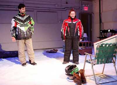 But this is not realityand, in this case, that's a good thing. (As for the snow, which falls from the sky in sheets and collects at the performers' feet, it's obviously fabricated, but let's not dwell on that.) With Jack Cummings III's canny production of this bewitching, snowflake-evanescent little piece, which ran a month in New York in 2006, you can invest two hours to dwell in a world where romance is once again magical. That's a heady antidote for the unpredictable weather patterns and frostbitten cynicism that are currently defining our outside world. This is perfectly appropriate, as in the tiny (and mythical) unorganized community that gives the play its name, the traditional rules simply don't apply. This is a place where romantic small talk about being closer together the farther apart you are becomes an epic quest, or where the figurative becomes literal when discussing such common topics as a broken heart, falling in love, or losing hope. And, most notably, a place where all of this makes sense and never comes across as contrived or twee. That Cariani is able to establish and maintain this atmosphere is amazing, not least because he does so across 11 scenes telling nine miniature stories. He links them together, sort of, by presenting them within the framework of a single wintry evening when the Northern Lights blaze through the sky just as unfamiliar feelings blaze through Almost's inhabitants' bodies. But the more compelling bond between them is the honesty and bewilderment that create and fuel love: the emotions even the greatest artists have struggled to articulate. Cariani doesn't struggle per se, but his are admittedly not probing examinations of complicated feelings. Rather, they're extrapolations, and gentle ones, of sensations and experiences to which we can all relate. But because the couples he chronicles (each playlet focuses on only two characters) believe in their heightened reality, and because Cummings's straightforward, declarative staging promotes it as well, the pedestrian becomes special and the cumulative effect sufficient to soften even the hardest of visages, if maybe only for a few minutes. Cummings, opting for an approach considerably more minimalistic and less naturalistic than the original production's, nonetheless provides an effective earthbound background against which the mystical moments can reasonably shine. (The features of the playing space, including staircases, doors, and even exit signs, factor into Cummings's work.) This quality is amplified by R. Lee Kennedy's comforting lights and especially Sandra Goldmark's scenic design, which suggests that all the crucial set pieces, like these people's lives, are half-buried in snowdrifts. When something unexpected happens, as occurs with relative frequency, it's because everyone involved has left it no other choice. This includes the actors, all of whom bear the unadorned, rugged charm of non–city dwellers with the necessary overlay of a belief in the fantastic. Donna Lynne Champlin, usually acclaimed as a musical theatre actress, gets to exercise her well-toned comic chops here, expertly wielding deadpan delivery and emotional innocence alike as she weaves from playing a woman recovering from the death of the husband she didn't love to a quietly inspiring waitress to a self-protective nurse to a first-time lover. Kevin Isola drily excels in a series of roles as "other men" who women rarely recognize is exactly the person they want. And Kelly McAndrew brings an alluring but quirky shimmer to the (frequently unanticipated) object of several paramours' affections. The fourth actor is Cariani himself, who proves ideal as a collection of well-meaning but socially clueless men who happily discover just how far their prospective partners might go for them. The contrast of his distinctly urban look with his restrained, non-pushy delivery highlights almost better than his writing the conflict at the center of Almost, Maine: whether anything, or anyone, so naturally simple canor shouldbe part of a world as brutally complex as the one in which we live. Cariani does his fair share of pratfalls, from getting hit with an ironing board to being brought to his knees after realizing how much he cares for someone he'd never before considered, and marshals precise comic timing when one of his characters must remove myriad layers of insulating clothing prior to an inaugural assignation with a longtime friend. But an undercurrent of seriousness runs through his performance, and is a reminder that's not easily dismissed: I may be making you laugh, but what you're seeing mattersbecause love matters. Trite? Maybe a little. But at Almost, Maine, which has exactly the same mission statement, you'll be too busy smiling to argue.