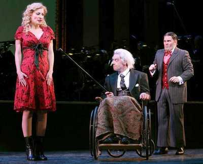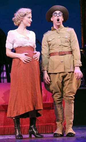 Even so, the show really belongs to librettist Simon. Though he'd only had one full-scale show on the Main Stem before Little Me (Come Blow Your Horn), he was already a theatrical-comedy expert capable of dispensing big jokes, small jokes, and throwaway gags with equal facility. His book's pacing might as well be jet-propelled, moving so efficiently along the scope of Belle's life while forgoing no humor along the way. He lampoons, much as Dennis did, the depravity, delusion, and banality of celebrity at its celebritiest. Unfortunately, neither York nor Borle unlocks the full spectrum of possibilities that Simon's scenarios present. Belle must be a parodically buxom, and yet innocently depraved, sexpot who leaves you constantly wondering about her motives and sanity. Though York looks juicily elegant and can certainly belt her way through the songs, her playing everything as the unassuming straight gal leads to Belle frequently seeming uninvolved in her own story. Belle must pose, coo, shimmy, and even slime her way up the ladder, but York's restrained, even conservative, take is out of step with someone who, as written, is an empty object of desire trying to make a real woman out of herself. Borle's problem is similar. In playing seven distinct characters in Belle's saga, he makes clear delineations between the high-born Noble, the ancient bank scion Mr. Pinchley, the French lounge singer Val du Val, and so on. But all his takes are very studied, even actorly, which doesn't leave much room for them to be hilarious. The track really calls for a true clown who's less obsessed with psychological justification than with squeezing every possible laugh out of every man. (Caesar would seem to fit the bill; I picture Bill Irwin, though one can also imagine a slightly less flamboyant version of Nathan Lane doing well.) Borle's good for consistent chuckles, but little more, even though his characters, who also include the dopey sergeant who eventually marries Belle, a German film director on the outs, and an Eastern-European crown prince were clearly designed to be riots. Luckily, there are no other perceptible problems. Rando's light-touch staging and Joshua Bergasse's mock-athletic choreography keep everything buoyant and joyous, and there's a killer B team on hand. Harris is ideal as Noble's emasculating mother, Robert Creighton a dynamo in a series of character roles, Lewis J. Stadlen and Lee Wilkof a dual Dutch delight as a pair of producers who recognize Belle's latent "talent," and Judy Kaye is pitch-perfect as the older Belle who narrates the look back on her life story. Lower-impact performances come from David Garrison as a narration-minded Dennis and Tony Yazbeck as a man who got away but kept coming back, but even they're top-notch. Taken together, everything ensures that this Little Me is required viewing for those who aren't convinced that frivolous comedy can (and should) be serious business. But it's also a reminder of what star quality addsand, when absent, what it can subtract. Though York and Borle can't shut down the show's comic engine entirelyno one couldthey can stall it just enough to stop the evening from attaining the sublimity of the finest Encores! outings. As it is, however, it's as close as we've seen anywhere lately to musical comedy at its best.
