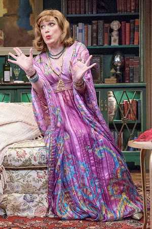When these words are barked in abject desperation late in The Tribute Artist, which just opened at 59E59 in a Primary Stages production, the resulting explosion of laughter has two distinct sources. The first is that it's all too easy to imagine it being spoken about the play's writer and star, Charles Busch, in many contexts in which contemporary stars rather than those of the Golden Age are considered more worthy of mention for purposes of bringing in (forgive me) the "younger crowd." The second, of course, is that it's hilariously untrue by any stretch. After all, one does not go to a Charles Busch play expecting to encounter anyone other than the likes of those name-checked here: Margaret O'Brien, Norma Shearer, Mary Astor, and Rosalind Russell, just for starters. Busch, as astute and accomplished an evoker of these great actresses (and countless others) as you'll find in mainstream New York theatre, uses them time and time again not as a crutch, but to comment on the evanescence of celebrity and the mutability of identity. Why, he constantly wonders, do remain so fascinated by lights blown out so long ago? The Tribute Artist, which has been directed by Carl Andress, posits that it's because identity is even more in flux in the world we live in, and someone who embodies the legends of the past is merely giving corporeal form to what we already know but are usually afraid to acknowledge. Because this is a play in which no one is who he or she appears to be on the outside, the one who makes a job of dressing up like faded (and usually desiccated) screen sirens in a Las Vegas drag revue looks like the sanest one in the room. That would be Jimmy (Busch, naturally), who makes his first appearance in a Rita Hayworth–like wig and is scarcely seen without it, though not for the reason you at first expect. He's fled from Nevada after being fired from the revue by his producer-boyfriend (who changed the locks on their condo while he was giving his final performance), and thus won't be returning from his annual two-week stint in New York. During that time every year, he's stayed with the elderly Adriana (Cynthia Harris), and isn't sure what he'll do this time when he has to move out of her opulent Greenwich Village townhouse. With no agent, no New York career, and not even an Equity membership, it's as though he doesn't exist.